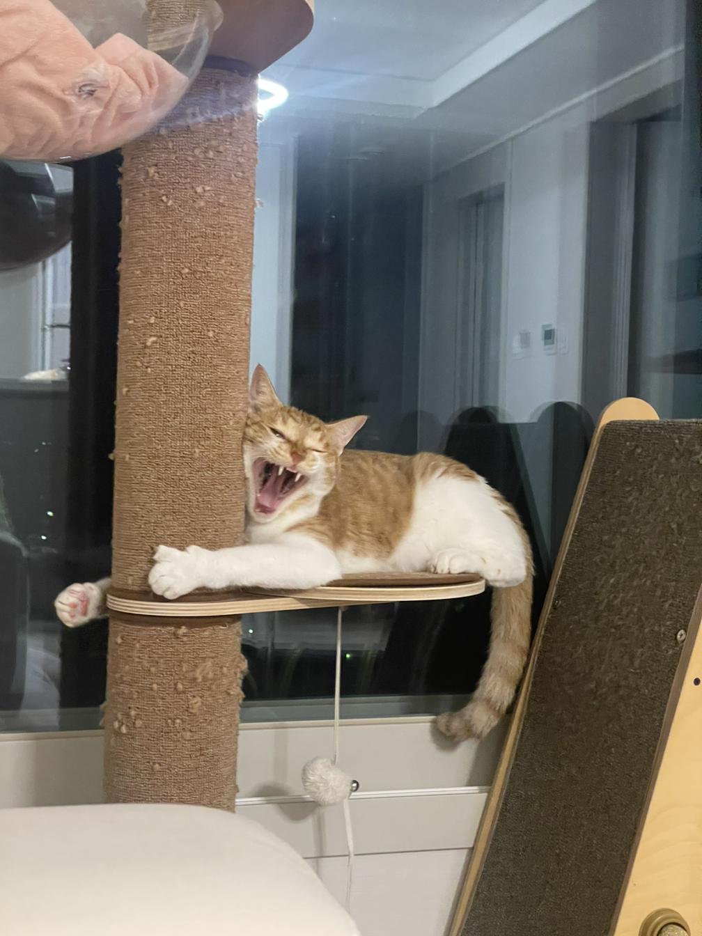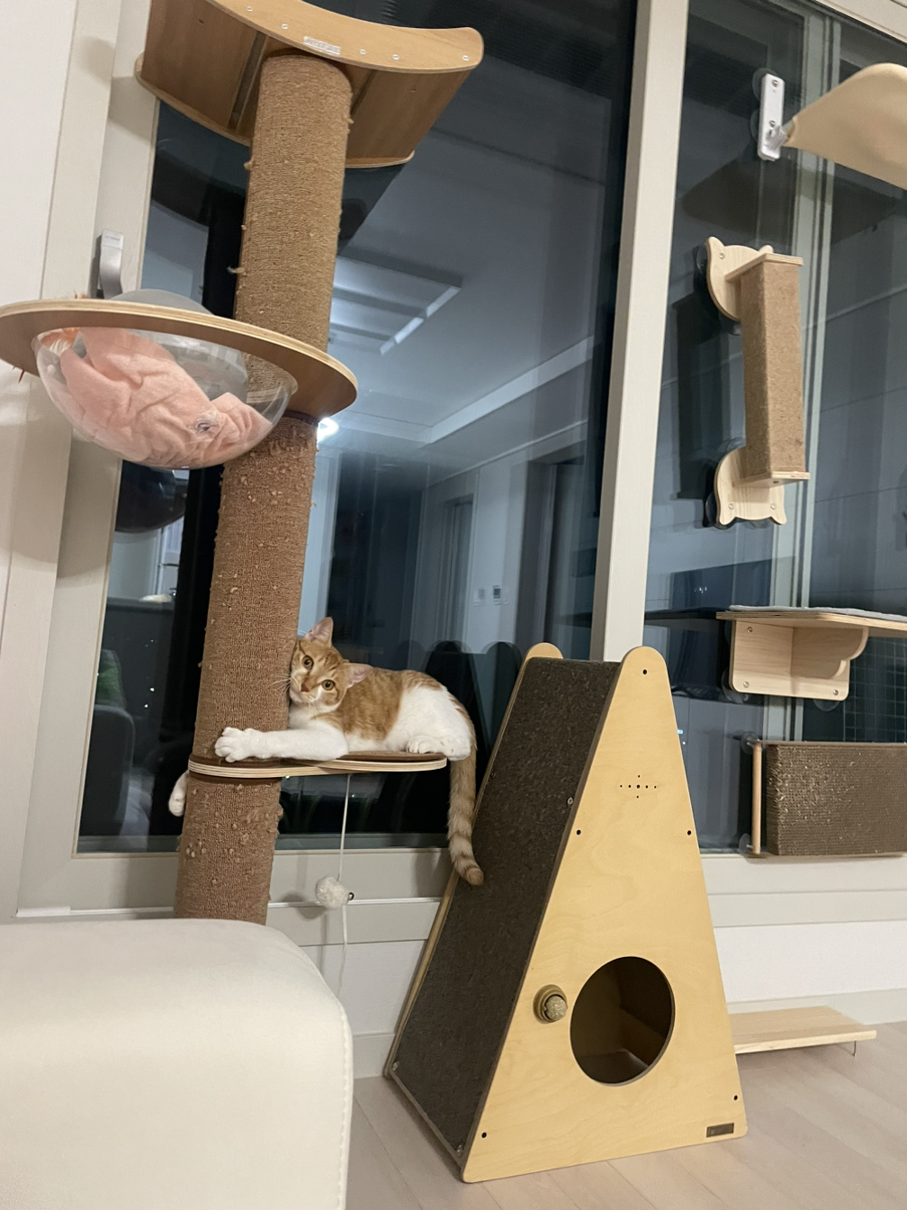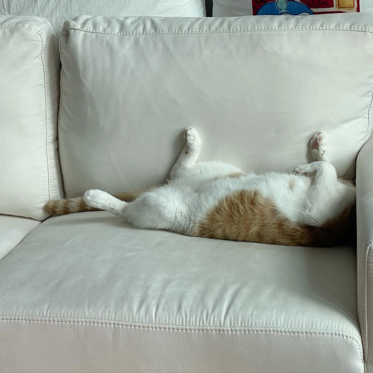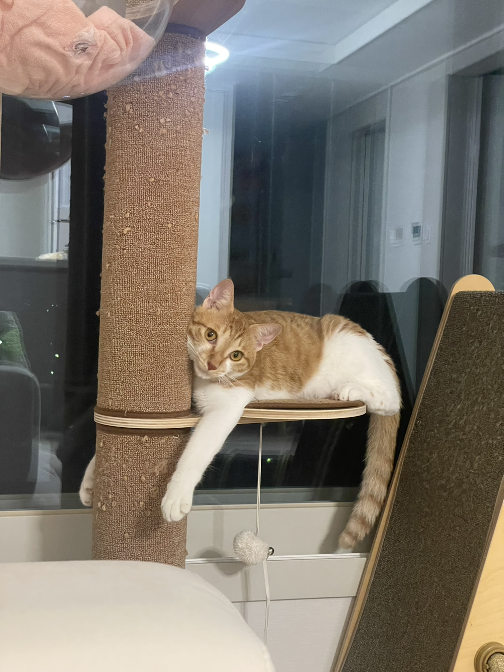 신나게 뛰어다니다 어느새 조용해진 거실을 바라보니 소파 위에 사람처럼 배를 발랑 까뒤집고 잠들어 있는 고양이의 모습에 집사의 얼굴에는 웃음이 번진다. 이날 처음으로 집사의 얼굴에 웃음이 번졌다.