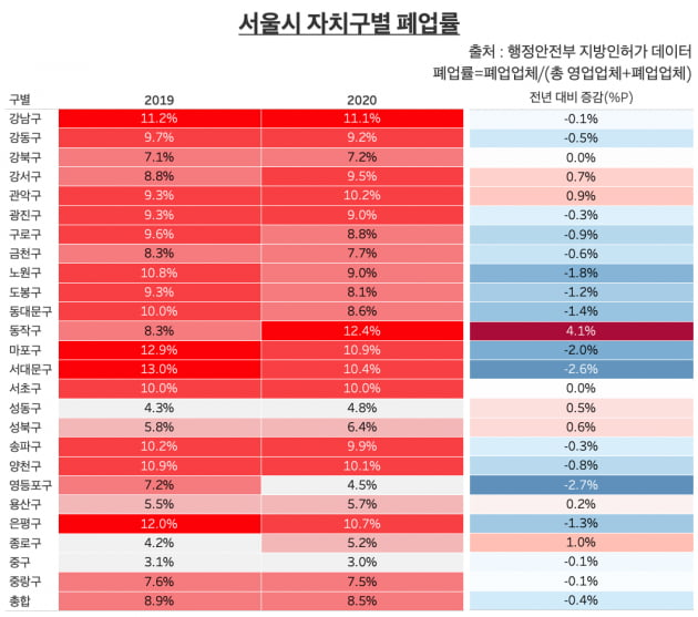 강남에서 사업하면 다들 성공할거라고 생각하지만 실제 폐업률은 서울시 자치구 중 두번째로 높다.