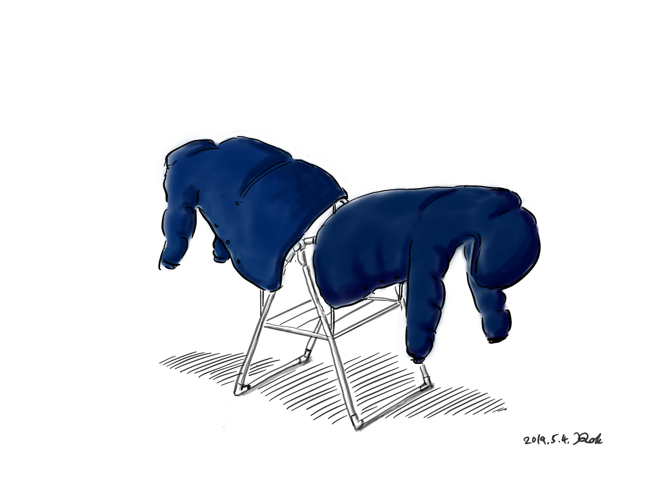 다시 보니, 뒤늦은 겨울 빨래로 건조대에 예쁘게(?) 널어놓은 패딩 때문이었다.