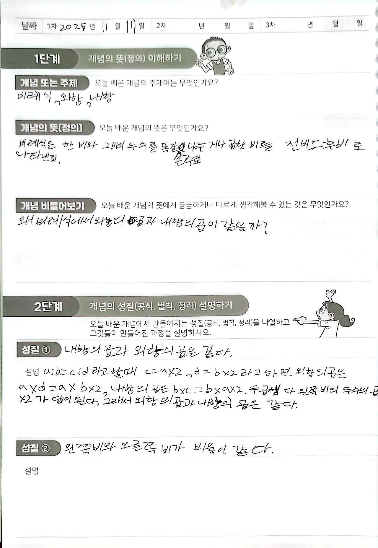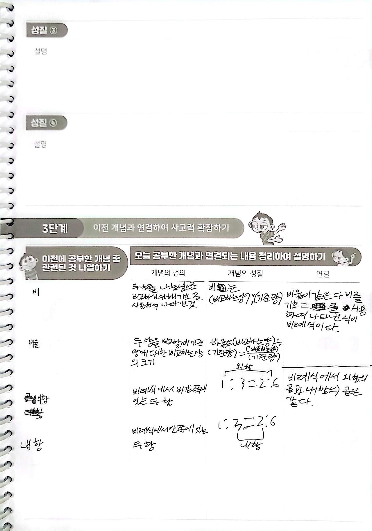 6학년 아이가 비례식을 배운 후 나름대로 정리하였다. (수학 노트는 반드시 볼펜으로 작성해야 하는데, 볼펜으로 글씨를 처음 써봐서 글씨가 평소보다 더 반듯하지는 않다. 하지만 글씨로는 웬만해선 문제 삼지 않는다. 심지어 '내향'이라고 썼다는 게 이제 보이네 ㅎㅎㅎ)