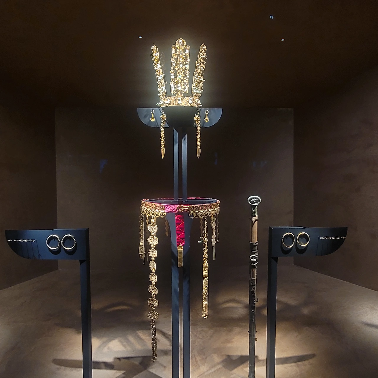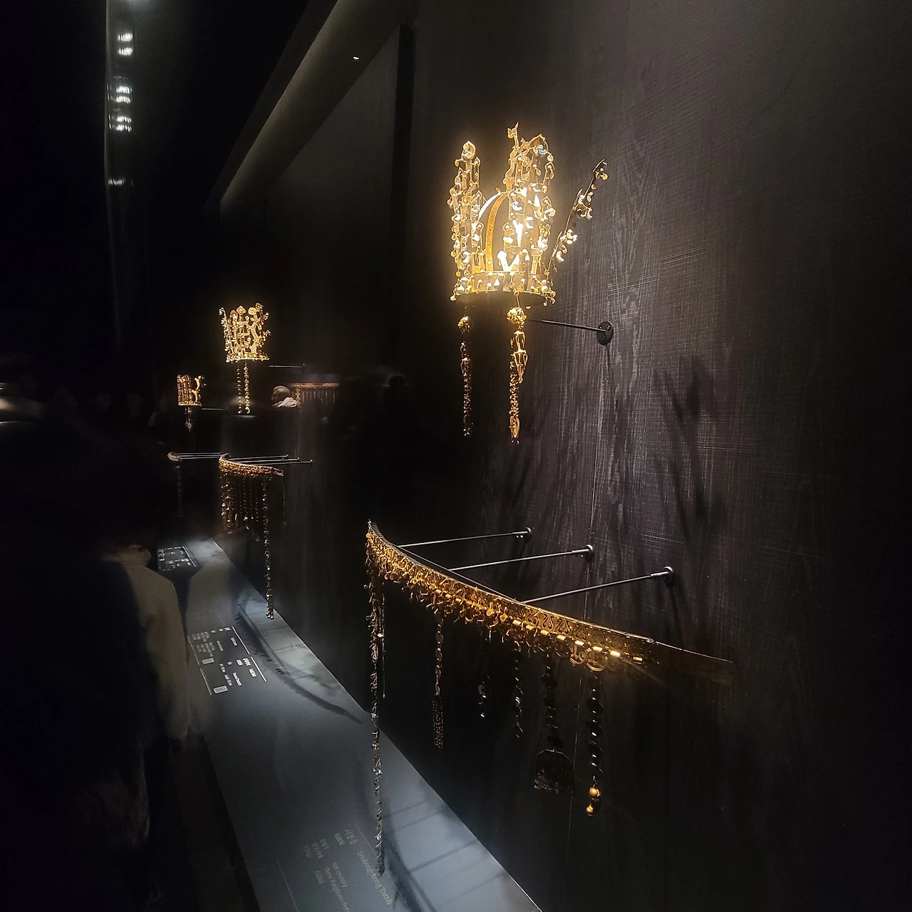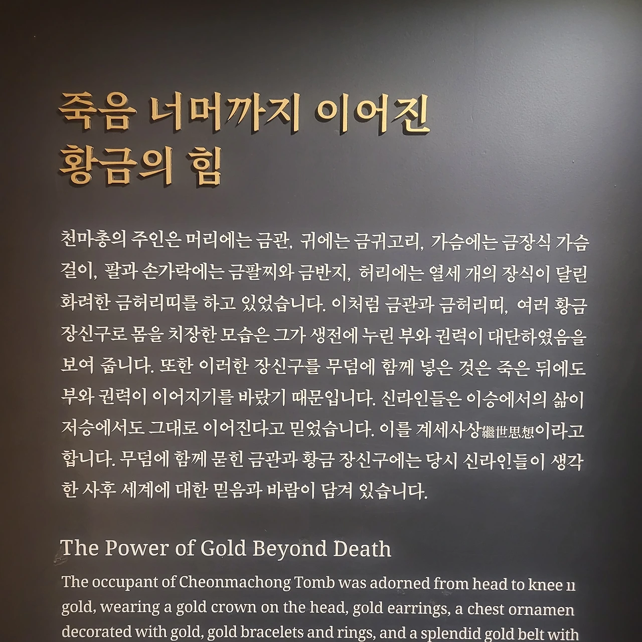 신라 황금 문화의 정점을 보여줌과 동시에 금관은 최고 권력자만 쓸 수 있었다는 것. 그리고 그 권력이 죽음 이후에도 영원하길 바라는 마음이었다는 걸 보여주는 신라 금관 전시. 아래의 설명을 읽으며 나는 생각에 잠겼다.