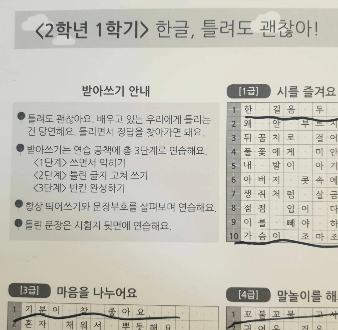 첫째가 받아 온 받아쓰기 자료입니다."틀려도 괜찮아요. 배우고 있는 우리에게 틀리는 건 당연해요. 틀리면서 정답을 찾아가면 돼요."라는 말에 제가 다 안심이 되더라고요.정답이 없는 것도 많은 세상이지만정답이 있는 건, 틀리면서 알아가면 되겠지요.