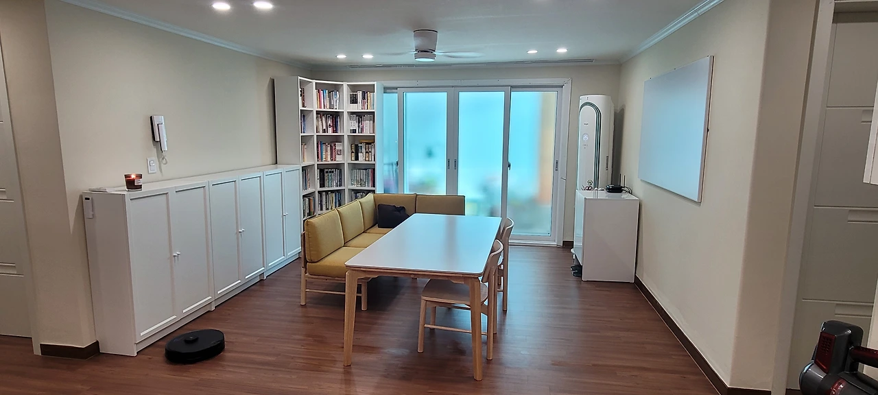 자녀가 모두 초등학생이 된 이후에는 푹신한 소파가 아닌 테이블과 의자 위주의 공간이 되었네요. 아이들이 청소년이 되면 또 달라지겠지요.
