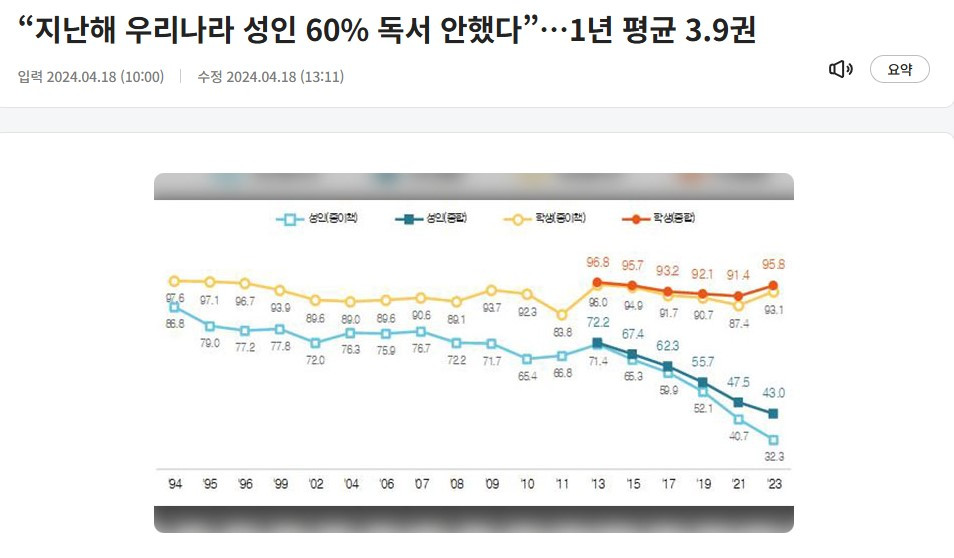 초등학생 때는 책을 많이 읽다가 중고등학생 때는 상대적으로 책 읽을 시간이 부족하겠죠. 그러다가 어른이 될수록 점점 더 책과 멀어지는 그래프를 매 보고서마다 볼 수 있습니다.