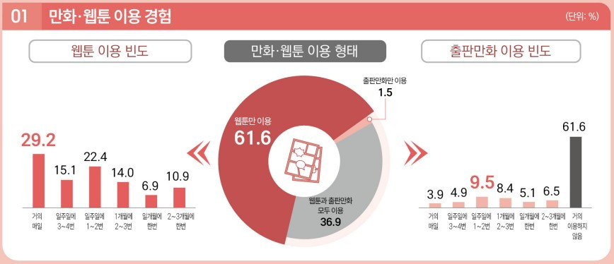 이렇게 청소년 스마트폰 사용률이 높으니, 만화에 관심 있는 학생이라면 웹툰에 접근하기가 만화책 접근보다 유용합니다. 들고 다니지 않아도 되고, 공부에 대한 스트레스를 해소하는 용도로 쉬는 시간에 틈틈이 볼 것 같아요. (물론 웹툰보다 영상, 게임에 훨씬 더 많은 여가 시간을 쓸 거라 생각합니다.) 또 웹툰은 댓글을 통해 다른 독자의 반응까지 살필 수 있어 아이들이 더욱 생동감을 느낄 것 같습니다.