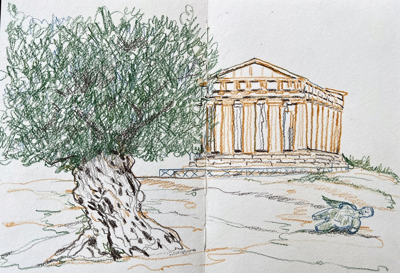 멀리 내려다 보이는 바다와 신전이 있는 언덕 사이에 올리브나무가 심어져 있는 밭과 길과 집들이 보였다.