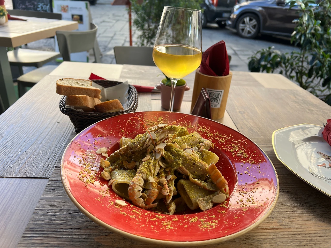 크로와상과 카푸치노를 마시고 거리구경을 하고 쇼핑을 하고 벼룩시징을 구경하고 맛이 궁금했던 피스타치오새우 파스타와 와인으로 점심을 먹었다.