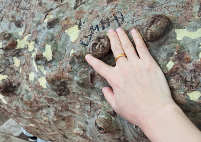 사람들이 나무와 가깝게 있는 것은 보기 좋았지만 나무기둥 여기저기에 새겨져 있는 낙서를 보니 사람들이
