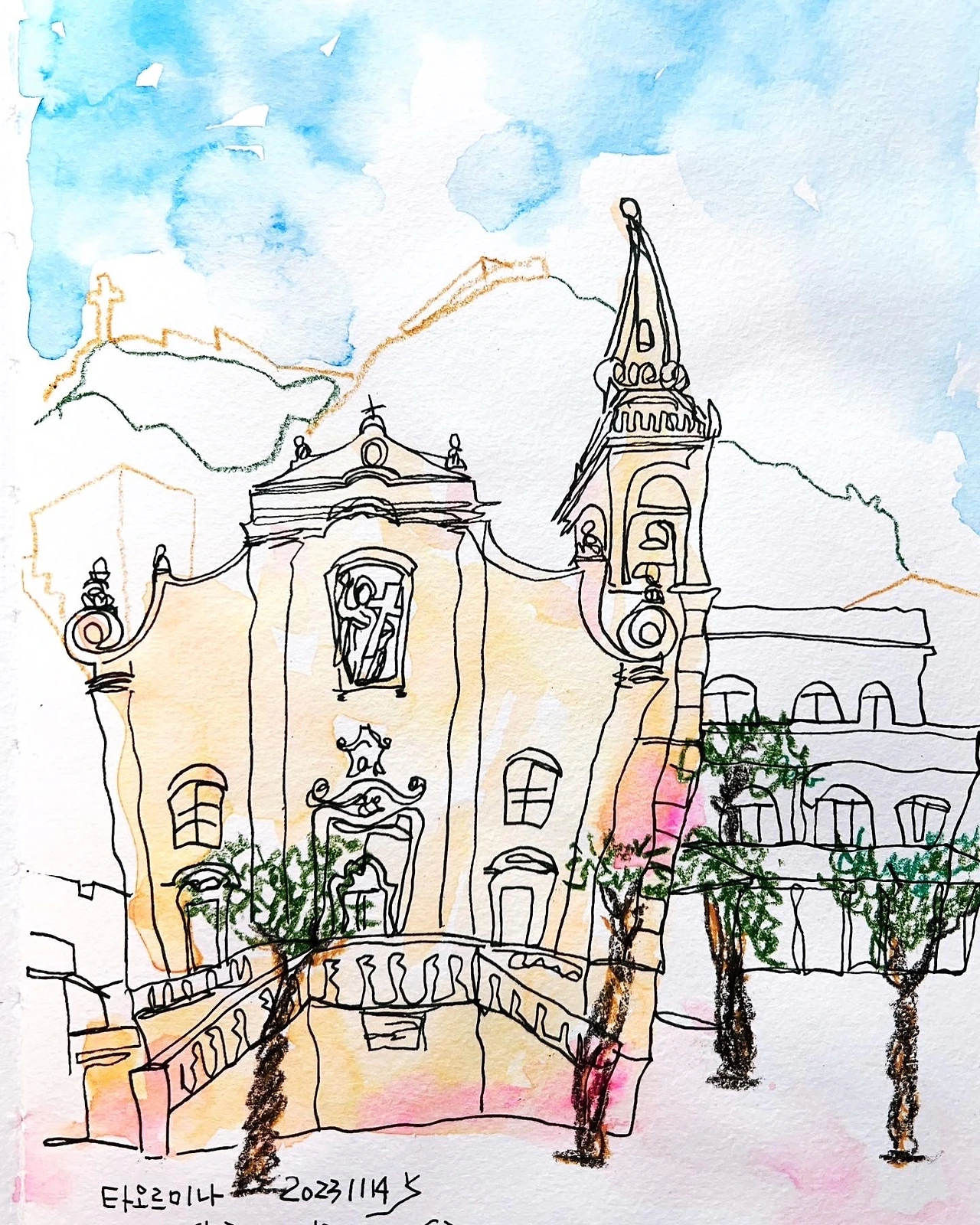 #여행스케치#콜라주#드로잉#드로잉저널#시칠리아#타오르미나#카스텔모라#윗동네#노을#산동네풍경#travelsketch#collage#drawingjournal#sicilia#taormina#castelmola#sunset