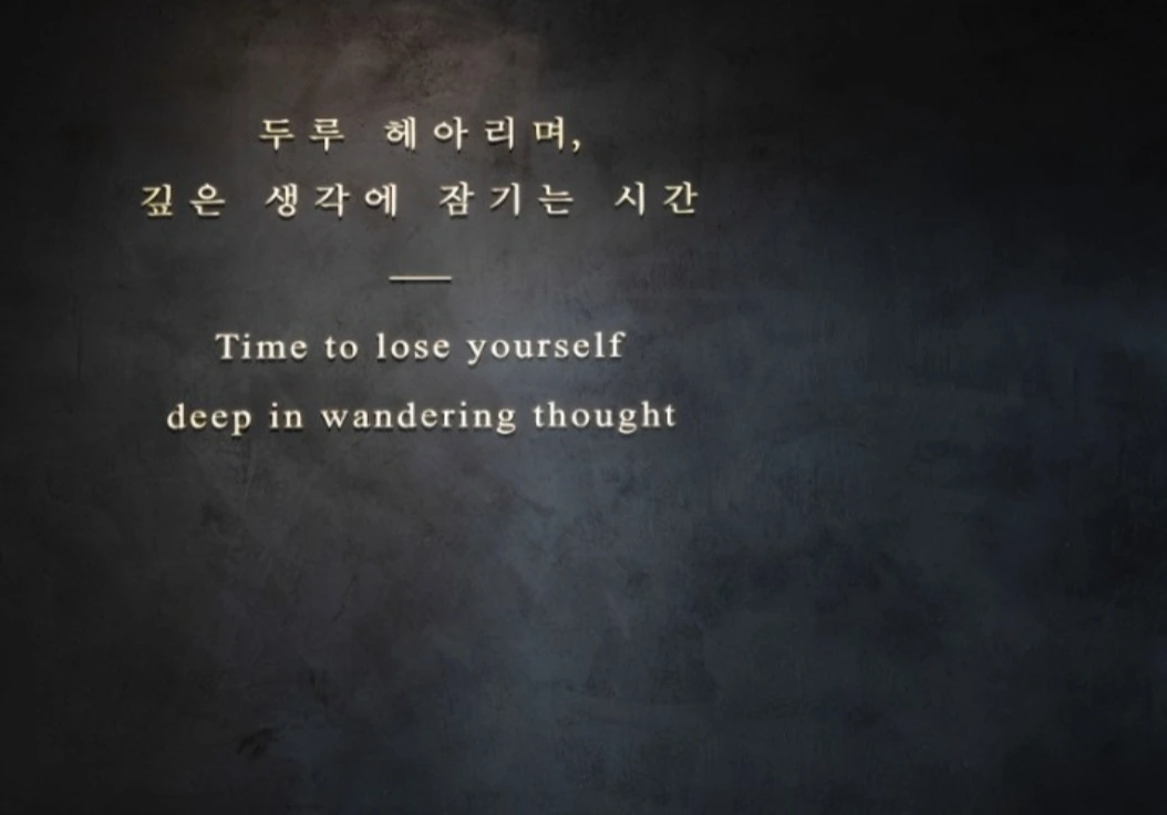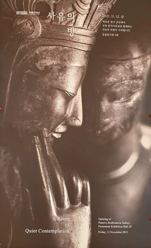 공간의 열기, 아우성과 탄식을 뒤로하고 ‘사유의 방’으로 발걸음을 옮긴다. 사유의 방은 삼국시대 6세기 후반과 7세기 전반에 제작된 우리나라 국보 반가사유상 두 점을 나란히 전시한 국립중앙박물관 내 전시 공간이다. 어둠으로 가득한 공간을 따라간다. 검은 공간만이 있는 어둡고 고요한 복도를 지나면 왼쪽 무릎 위에 오른쪽 다리를 얹고 오른쪽 손가락을 살짝 뺨에 댄 채 깊은 생각에 잠긴 반가사유상을 만나 볼 수 있다. 반가사유상은 반가부좌를 튼 채 생각에 잠겨있는 모습을 표현한 불상이다. ‘사유의 방’은 두 점의 반가사유상과 함께 사유에 빠져드는 시공간의 체험을 위해 마련된 공간이다. 요란한 안내 문구나 장식물은 없다. 전시마다 유행하는 VR이나 QR, 영상은 더더욱 없다. 아무것도 없다는 그 특별함이 기교를 너머 서는 장엄함을 선물한다. 깊은 어둠과 자그마한 불빛, 정적 그리고 고요함. 전시장에서는 낯설지만 일상에서는 익숙한 것들이 두 반가사유상과 함께 마련되어 있는 곳이다. 반가사유상 둘레를 따라 원을 그리며 걷다 천장을 올려다보니 나는 어느새 별빛이 내리는 사유의 숲을 걷는 철학자가 되어있었다. 도시 속에 사유라는 정적인 시간을 선물하고 그 시간을 되돌아보는 계기를 마련해 준다. 반가사유상은 깊은 생각에 빠진 석가모니의 모습이면서, 깨달음을 잠시 미루고 있는 수행자와 보살의 모습이다. 반가의 자세는 수행과 번민이 맞닿거나 엇갈리는 순간이다. 살짝 다문 입가에 잔잔히 번지는 ‘미소’는 깊은 생각 끝에 도달하는 영원한 깨달음의 찰나를 표현한 것만 같다. 이 찰나의 미소에 우리의 수많은 번민과 생각이 녹아들어 있다. 이제까지 밝은 빛 속에서 만난 반가사유상의 미소에 집중했다면 이제는 사유의 시간과 고뇌를 느껴 볼 시간이다.