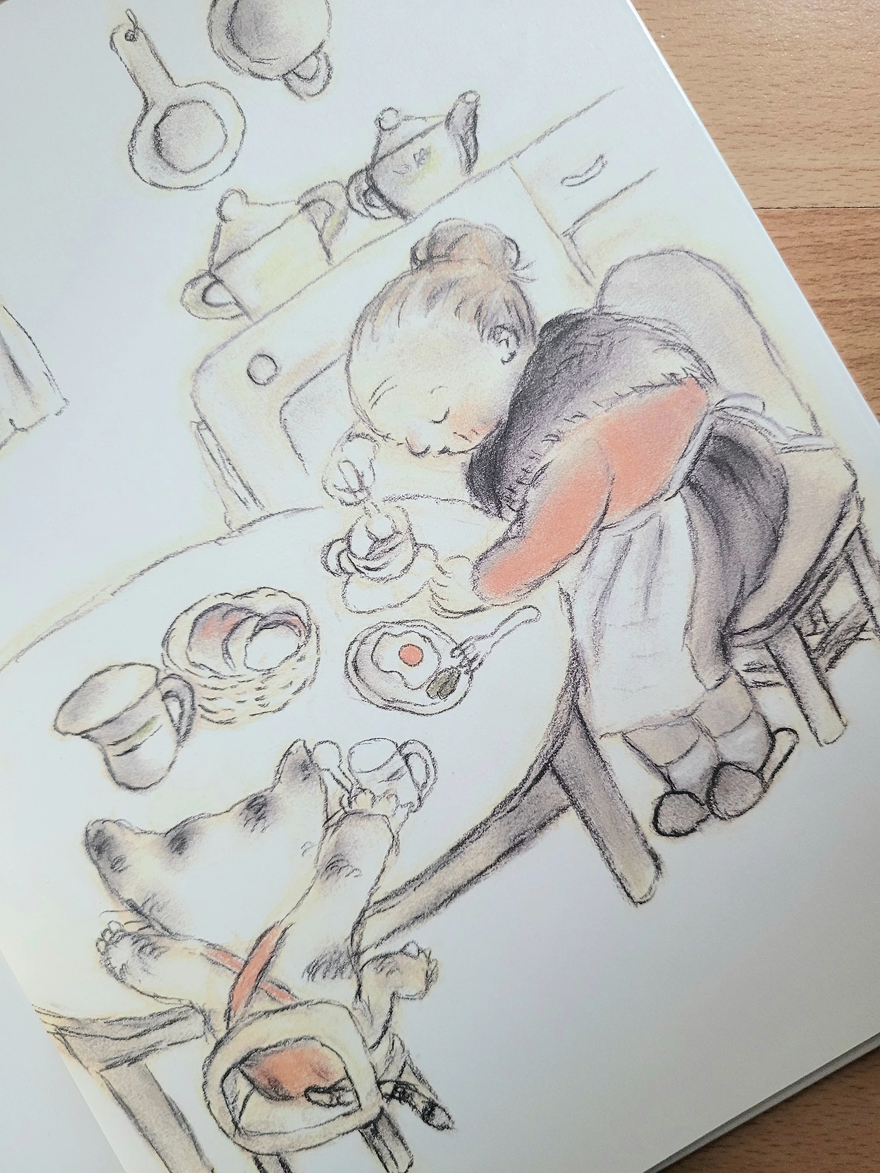 개울가 텃밭이 있는 작은 집에 98세의 할머니는 다섯 살 난 고양이와 함께 살고 있다. 낚시를 가자고 조르는 고양이에게 할머니는 “하지만 나는 98살인걸, 98살 난 할머니에게 그건 어울리지 않아” 말한다. 그렇게 할머니에게 어울린다고 생각되는 일만 한다. 할머니에게 어울리는 일은 의자에 앉아 졸거나 우두커니 창밖을 바라보는 일이다. 아무런 일도 일어나지 않는 노년의 삶이 행복한 것이라고 나는 생각 한 적이 있었다. 우두커니 창밖만 바라보는 ‘하지만 할머니’처럼. 가늘게 뜬 눈에 오동통한 두 볼이 귀여운 할머니는 매사에 의욕이 없다. 2~3가지의 절제된 색과 함께 거친 듯 짧게 이어져 경쾌한 목탄 그림은 할머니의 지루한 생활과 어울려 보이지 않는 것 같았다.