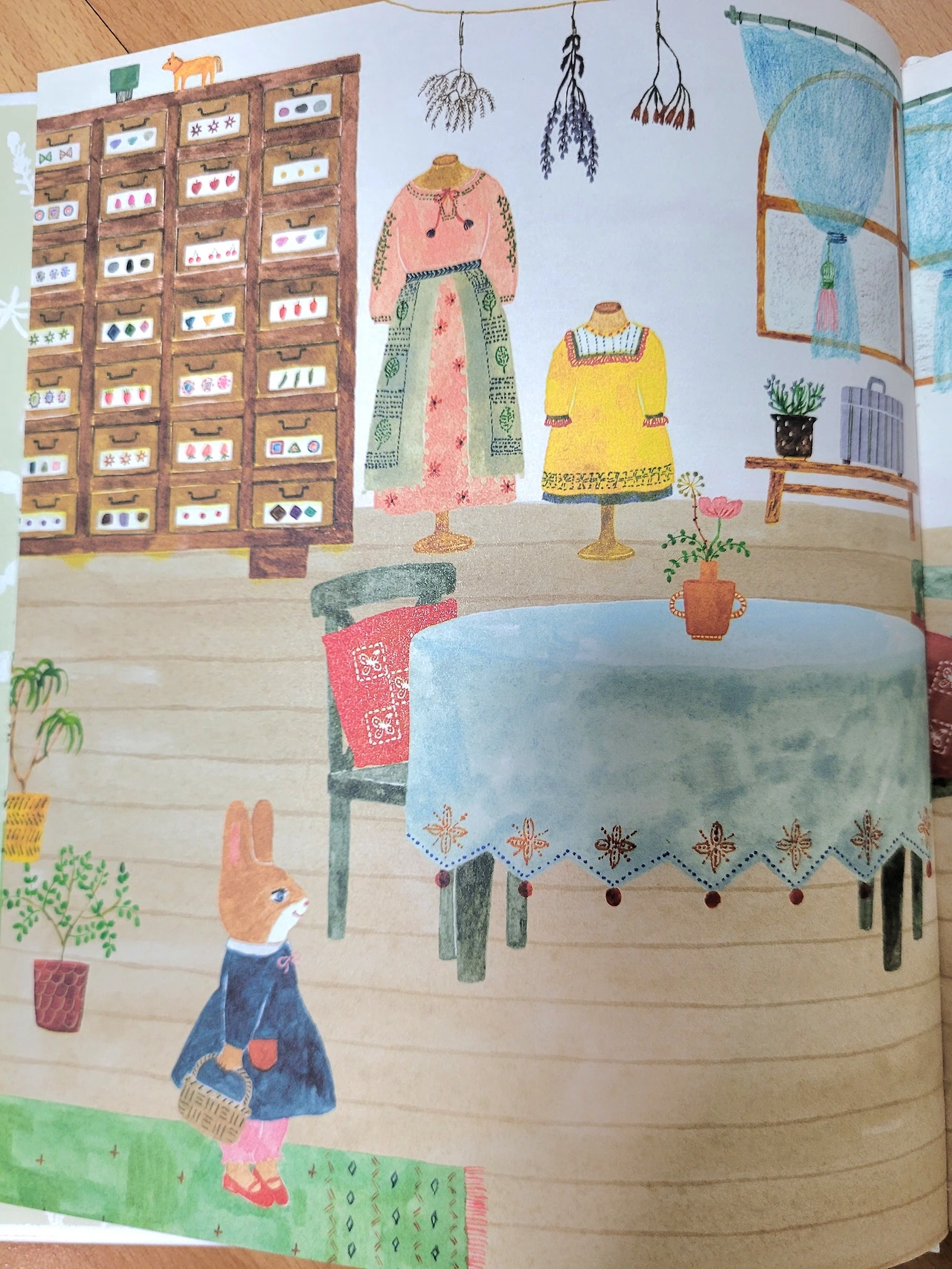 아기 토끼 사키는 봄바람에 이끌려 숲 속 양장점으로 향한다. 나무마다 새잎을 터뜨린 연두 빛 숲길을 걷는다. 숲 속 양정점에 도착한다. 재봉틀을 돌리던 미코 아줌마는 사키를 반갑게 맞이한다.