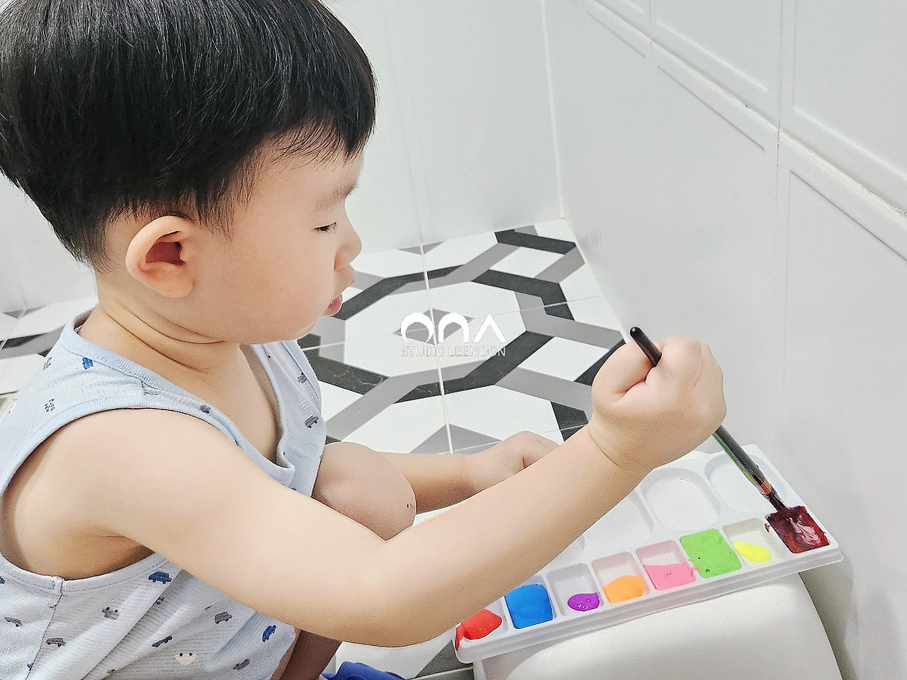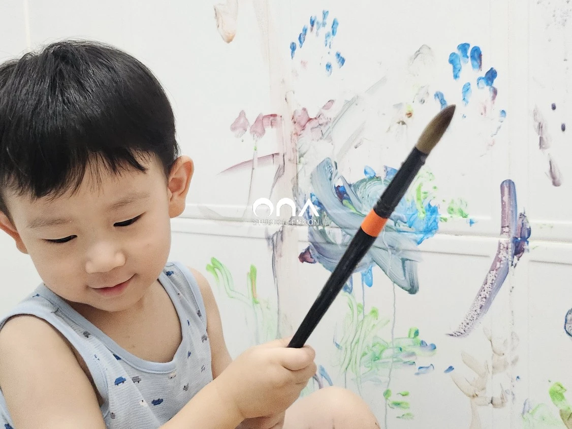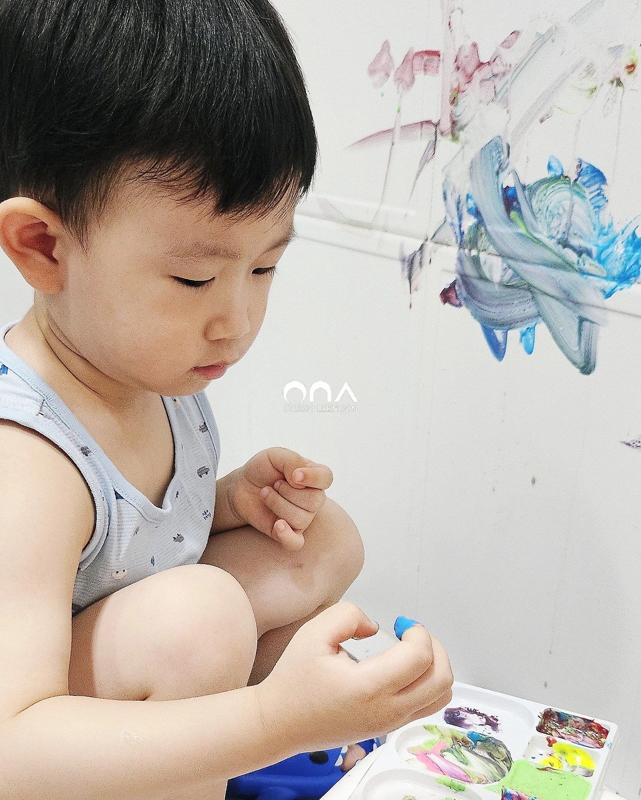 욕실에서의 미술놀이는 대개 목욕 전, 아이가 먼저 “물감 놀이 하고 싶어”라고 말하는 날에 이루어졌다.