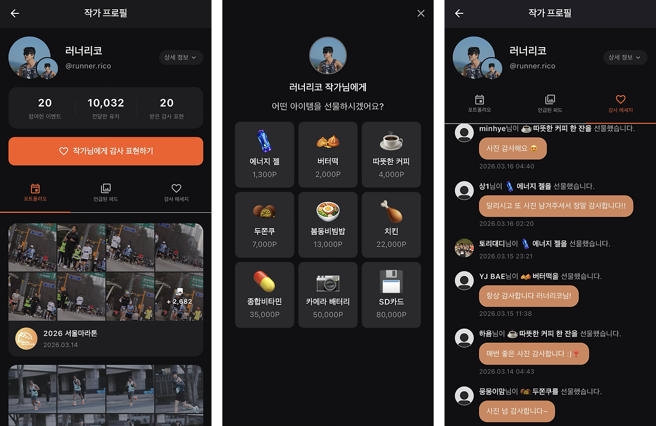 나는 SSRC(성수러닝크루)를 7년째 운영하면서 이걸 가까이에서 봐왔다. 크루에서 사진을 찍어주는 작가 친구가 있었는데, 아무런 보수 없이 매 세션에 나와 촬영하고, 수천 장의 사진을 고르고, 편집까지 해서 전달했다. 크루원들도 고마워했다. 근데 그 고마움이 "사진 잘 봤어요!"라는 한마디 정도에서 끝나는 경우가 많았다. 마음은 있는데 표현할 수 있는 구조가 없었던 것이다.