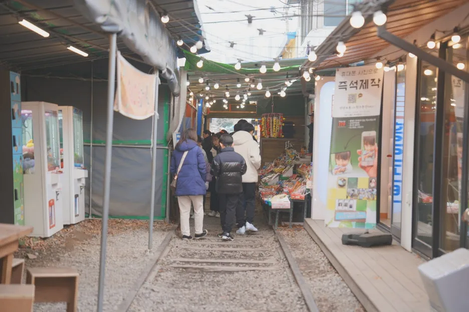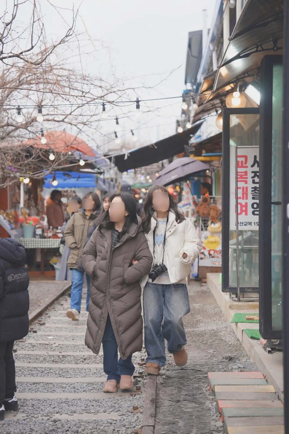 철길마을은 두 블록으로 구성이 되어 있었는데 주차장쪽에서 이동을 하다보면 나오는 첫번째 블록 철길 주변에는 별다른 시설이 없어서 약간 을씨년스러웠는데, 횡단보도를 건너 본격적인 철길마을로 들어서니 철길 주변으로 상점, 노점상들이 오픈이 되어 있어서 구경하는 재미도 있고, 8090 이전 시대로 돌아간 느낌이었다. 아버지, 어머니 세대들이 입으셨을법한 옛날 교복을 대여해서 입고 다닐 수 있었는데(5000원), 우린 대여하진 않았다. 다만 걸으면서 보니 어르신들이 많이 교복을 입고 다니고 계셨고, 사진도 많이 찍고 있었다. 어르신들의 표정은 밝고, 즐거운 표정이었다. 그들은 그시절로 돌아가 계셨던 걸까.