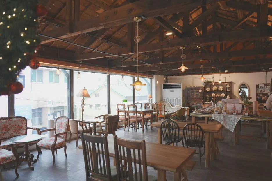 옛날 적산가옥을 리모델링해서 만든 카페인 것 같은데 입구가 두군데였다(나중에 나와서보니). 우리가 들어갔던 한쪽 입구는 1층 옷가게를 통해서 올라가게 되어 있었다. 옷 매장 안에 옛날 주택의 다락으로 올라가는 듯한 나무 계단이 가파르게 있었는데, 그곳을 통해서 2층 카페로 갈 수 있었다.