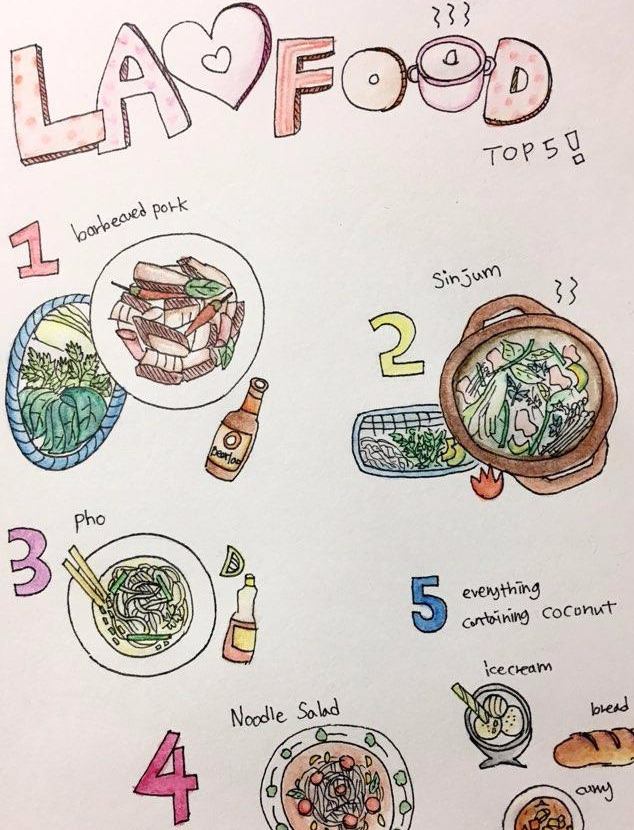 라오스는 라오어를 쓴다. 라오스에 가기 전 그래도 그 나라말 몇 마디는 알아야하지 않을까 싶어 필수 문장들 몇개를 적어갔다. 안녕하세요, 감사합니다, 사랑합니다, 이름이 뭐예요, 얼마예요, 그리고 맛있어요. 라오스에서 가장 많이 쓴 말은 바로 맛있어요, "쌥쌥" 이었다. 정말이지 먹은 모든 음식들이 하나같이 맛있었다. 특히 고수를 먹긴 했지만 즐겨먹기까지 하진 않았는데 라오스에서 고수 맛을 알게되었다. 내 삶의 오복(!) 중 하나이니라. 음식이 얼마나 좋았는지, 돌아와서 라오 푸드 TOP5를 나름대로 선정하여 그림으로까지 그려두었다.