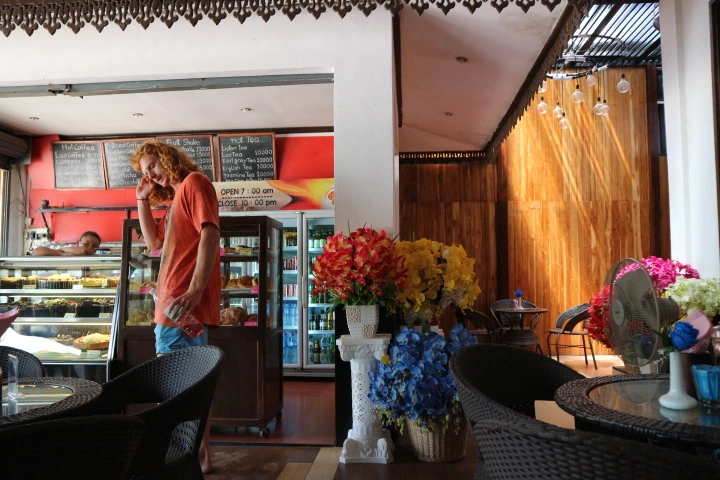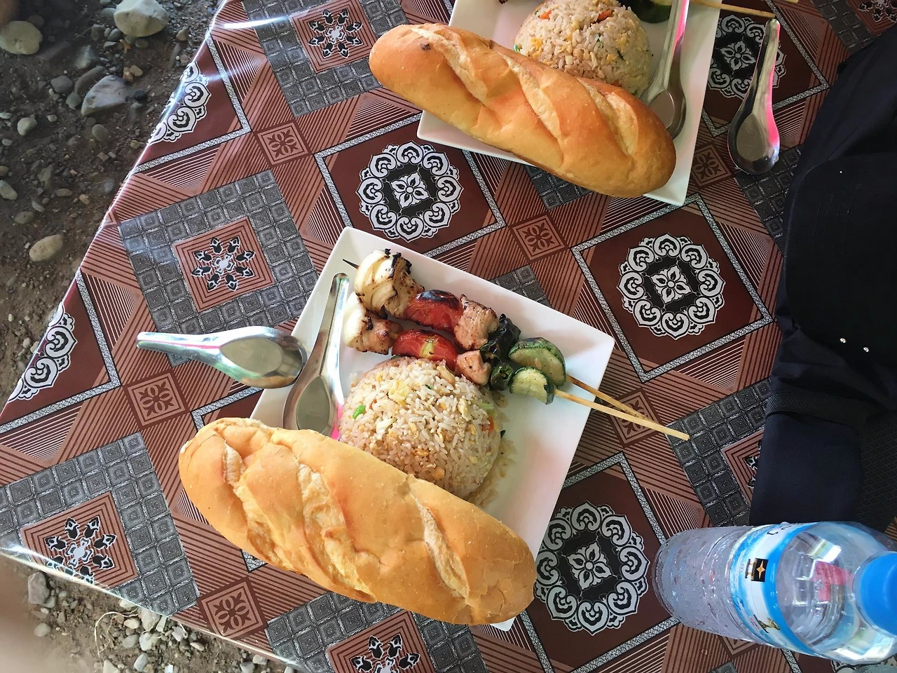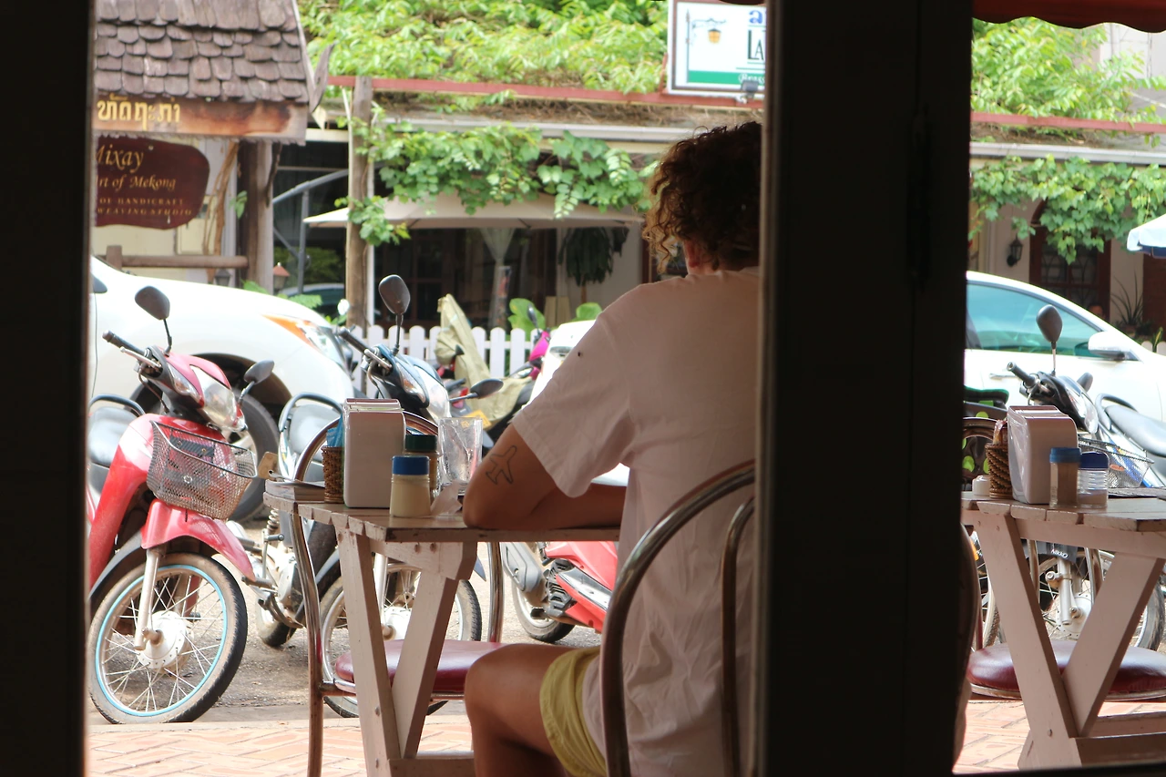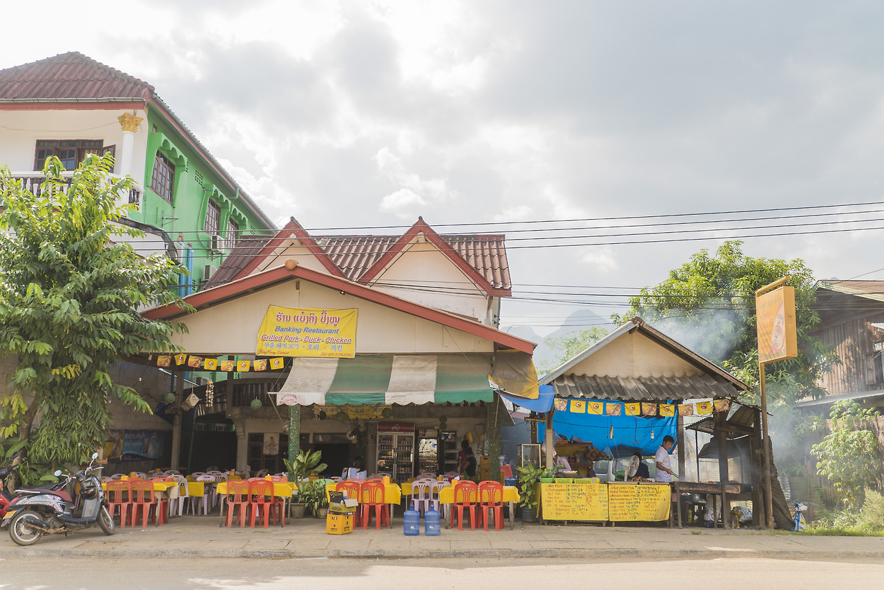 방비엥에서의 숙소였는데, 원래 계획은 샌드위치를 사서 숙소에 가서 샤워 후 시원한 맥주와 함께 먹는 것이었으나, 물과 전기가 나갔다는 것이다. (라오스에서는 종종 있는 일이다!) 그래서 이러지도 저러지도 못한 채 저기 보이는 저 오두막에서 먹었다. 정말 더웠던 날.