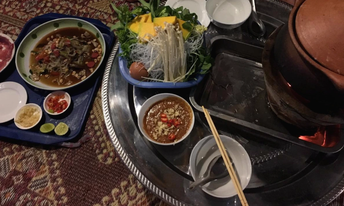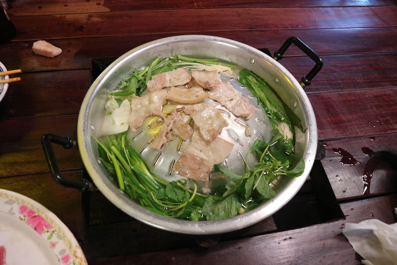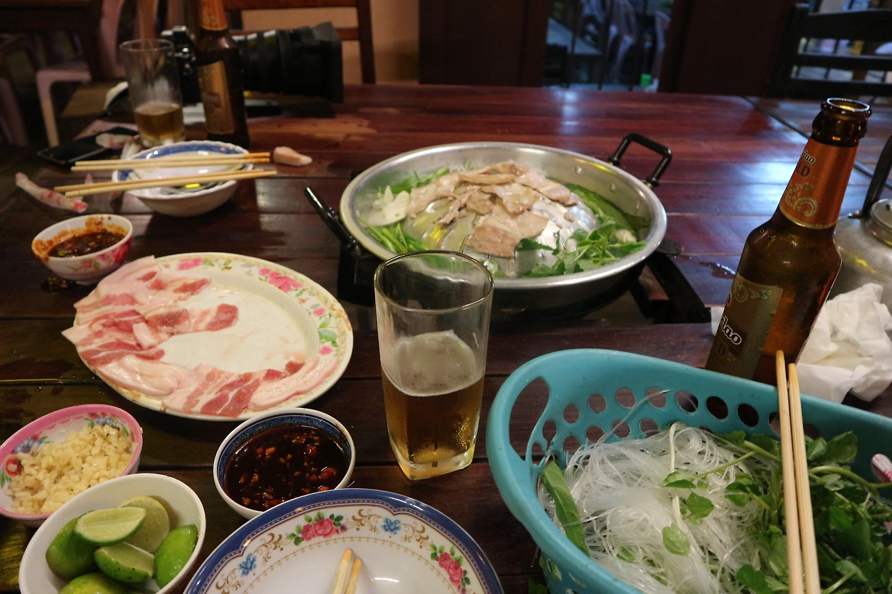1,2위가 막상막하였다. 2위는 바로 신쭘이라 불리우는 라오스식 항아리 샤브샤브. 앞서 <라오스에 뭐가 있냐면 1> 에서 말했던 조이가 운영하는 식당에서 신쭘을 우연히 맛보게 되었다. 야시장을 찾아떠난 곳에서 야시장과는 조금 떨어진 곳에 위치한 이 식당이 무언가 강력하게 끌렸고, 뭔지도 모르지만 옆에서 라오스 사람들이 맛있게 먹고있으니 따라 시켜봤다. 그리고 그 맛에 반해 심지어 체했던 와중이었는데도, 방비엥을 떠나면 못먹을 것 같아 다시 들러 또 한 사발을 다 먹었다. 항아리에 고기 (혹은 해산물), 각종 야채를 넣은 샤브샤브 스타일로 계란과 국수를 풀어먹는 게 또 꿀맛이다. 더불어 고수향이 가득한 파파야 샐러드를 곁들인다면 최고이고, 그래도 아직 더 먹을 수 있다면 후식으로 코코넛 아이스크림을 먹으면 행복해진다. 첫 방문 후 맛에 감동하여 두번 째 갔을 때 정말 사진을 하나하나 꼼꼼히 찍어뒀다. 위치는 여행자 거리를 벗어나서 야시장도 지나서 코코넛 아이스크림 파는 어딘가 길가..... 설명할 수가 없다.