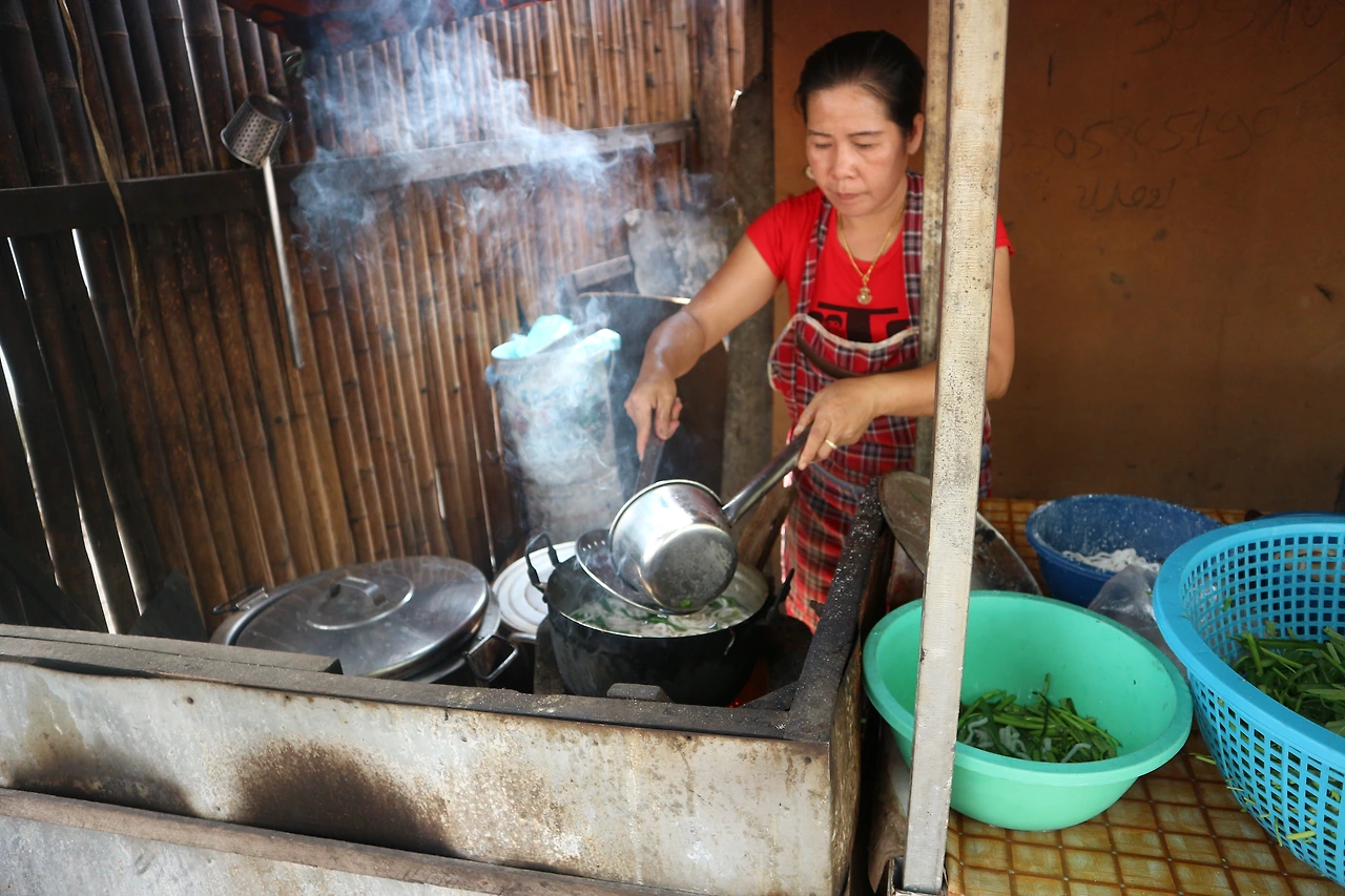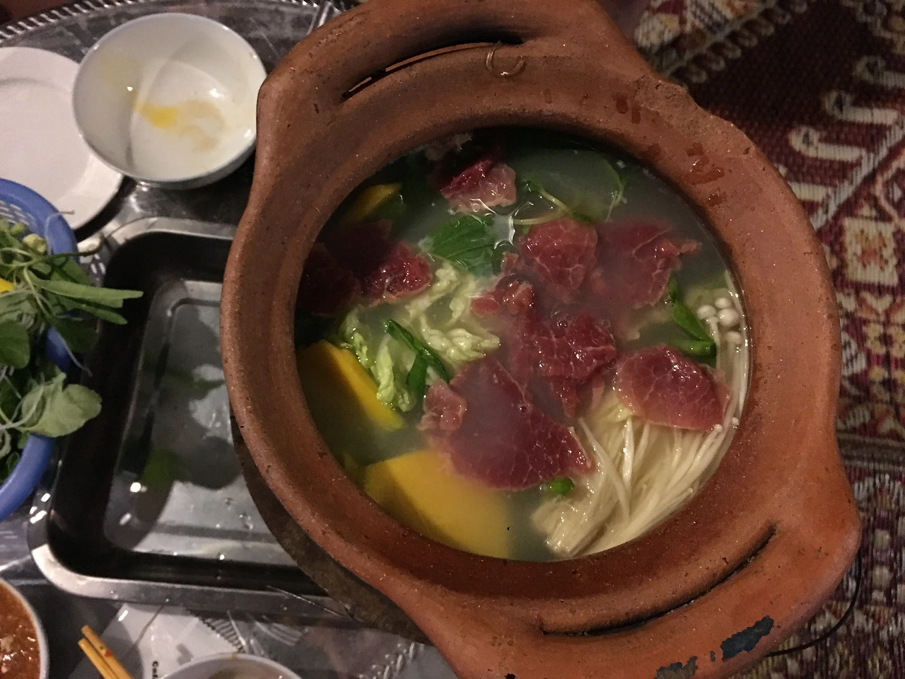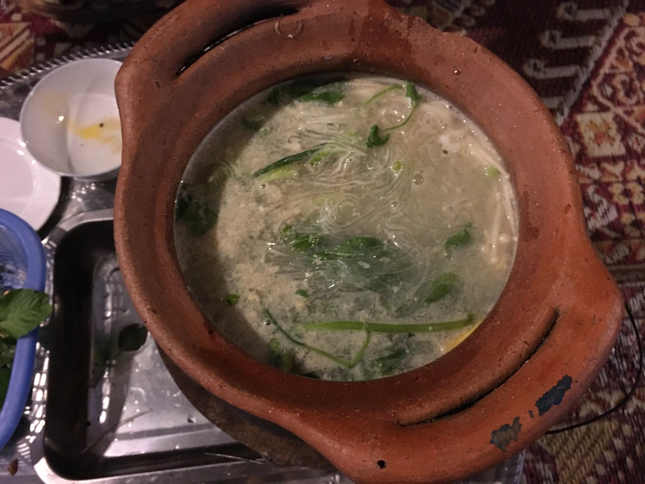 1,2위가 막상막하였다. 2위는 바로 신쭘이라 불리우는 라오스식 항아리 샤브샤브. 앞서 <라오스에 뭐가 있냐면 1> 에서 말했던 조이가 운영하는 식당에서 신쭘을 우연히 맛보게 되었다. 야시장을 찾아떠난 곳에서 야시장과는 조금 떨어진 곳에 위치한 이 식당이 무언가 강력하게 끌렸고, 뭔지도 모르지만 옆에서 라오스 사람들이 맛있게 먹고있으니 따라 시켜봤다. 그리고 그 맛에 반해 심지어 체했던 와중이었는데도, 방비엥을 떠나면 못먹을 것 같아 다시 들러 또 한 사발을 다 먹었다. 항아리에 고기 (혹은 해산물), 각종 야채를 넣은 샤브샤브 스타일로 계란과 국수를 풀어먹는 게 또 꿀맛이다. 더불어 고수향이 가득한 파파야 샐러드를 곁들인다면 최고이고, 그래도 아직 더 먹을 수 있다면 후식으로 코코넛 아이스크림을 먹으면 행복해진다. 첫 방문 후 맛에 감동하여 두번 째 갔을 때 정말 사진을 하나하나 꼼꼼히 찍어뒀다. 위치는 여행자 거리를 벗어나서 야시장도 지나서 코코넛 아이스크림 파는 어딘가 길가..... 설명할 수가 없다.