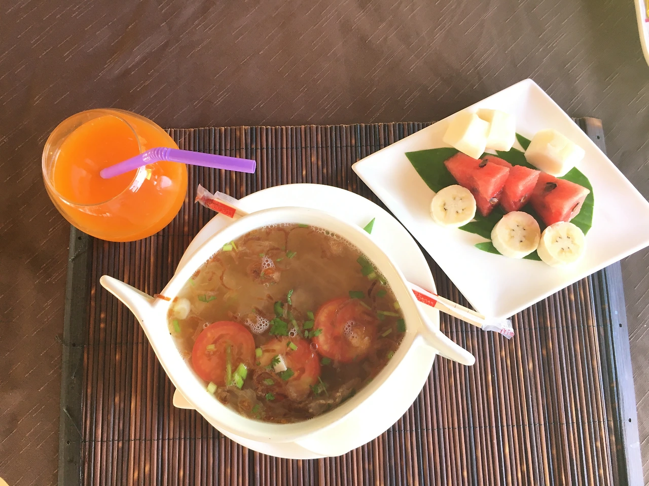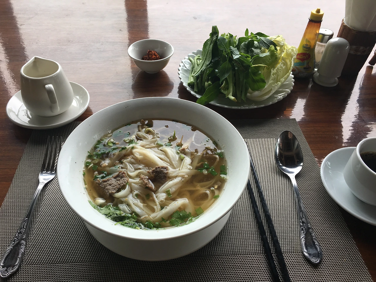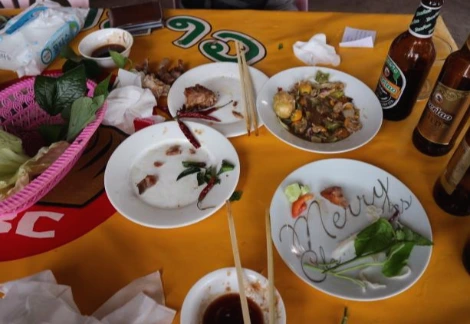 라오스 사람들 뿐이어서 그들이 먹는 것처럼 피쉬소스와 건더기스프(?) 같은 걸 넣고 먹었다. 남김없이 싹싹..