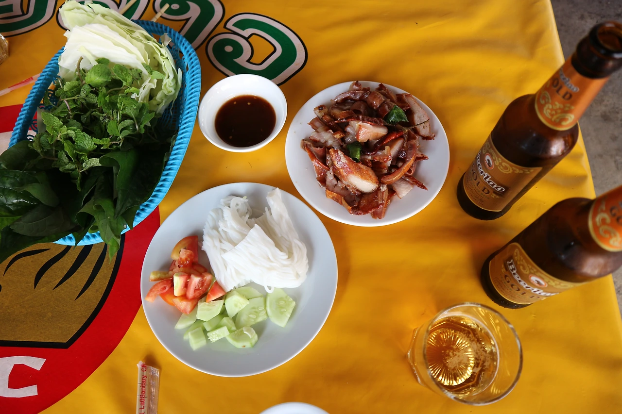 우선 치열한 경쟁을 뚫고 당당히 1위를 거머쥔 음식은 돼지 바베큐와 비어라오다. 방비엥 도착 첫 날, 아무런 정보도 없는 채로 스쿠터를 타고 거리를 빙빙- 돌 때, 불에서 굽는 바베큐를 발견한 것이다. 그리고 망설임없이 그곳에 들어갔고, 방비엥에 머무른 3일 내내 그곳에 방문했다. 돼지, 오리, 닭 등을 먹었는데 역시 돼지가 짱이고. 뽈살과 곱창도 함께 나오는 모둠구이가 가장 좋다. 1인분에 약 3,000원 정도였으니 맥주까지 정말 마음껏 먹어도 20,000원이 채 나오지 않는다. 더불어 야채도 함께 주는데 같이 싸먹는 맛이 일품이고, 고기와 함께 나오는 레몬그라스 역시 맛있다. 또한 고수향 가득한 샐러드 & 비어라오와 함께라면 몇 인분이고 계속 먹을 수 있다. 먹고싶다..... 저거 먹으러라도 라오스는 다시 가고싶다.