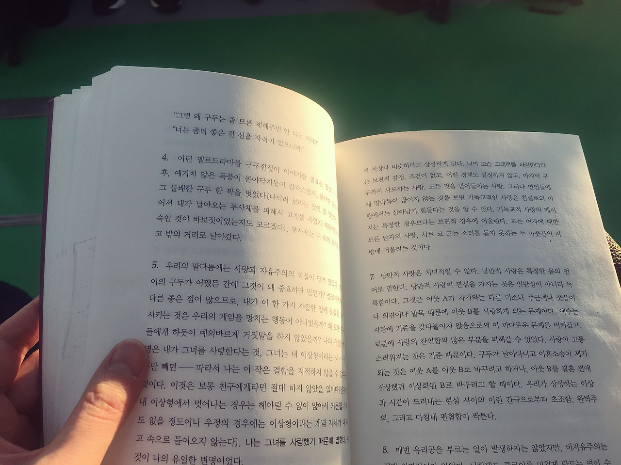 하지만 책 속에 두 남녀는 이 모든, 우리가 느껴온 저 사랑이라는 정의가 그저 두 사람의 인식에 불과한 것임을 보여준다. 사실 운명적인 것 같은 너와 나의 만남은, 그 자리에 너가 아니라 다른 누군가가 나왔다면 그 누군가로 충분히 대체될 수 있었으며, 상대는 전혀 특별하지 않고 나와 똑같이 약점과 이중적인 면을 갖고 있는 평범한 사람이다. 또한 상대를 위한 말과 행동은 사실은 나의 자의식을 발견하기 위한 말과 행동에 불과하다. 그리고 어쩌면 너를 사랑하는 이유들은 조건으로 나열할 수 있을지도 모른다.
