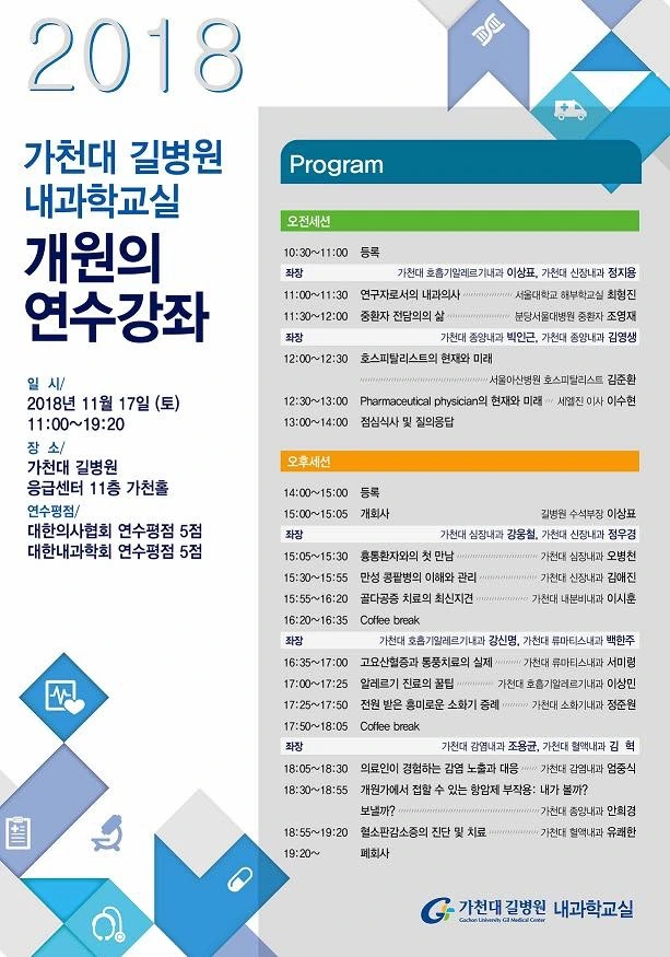 18년 11월 17일 토요일에 가천대 길병원에서 병원 내 새로운 직종인 입원전담전문의(호스피탈리스트)를 소개할 기회를 주셨습니다.혹시 시간되시는 선생님들은 오셔서 이야기 나눌 수 있으면 좋겠습니다.