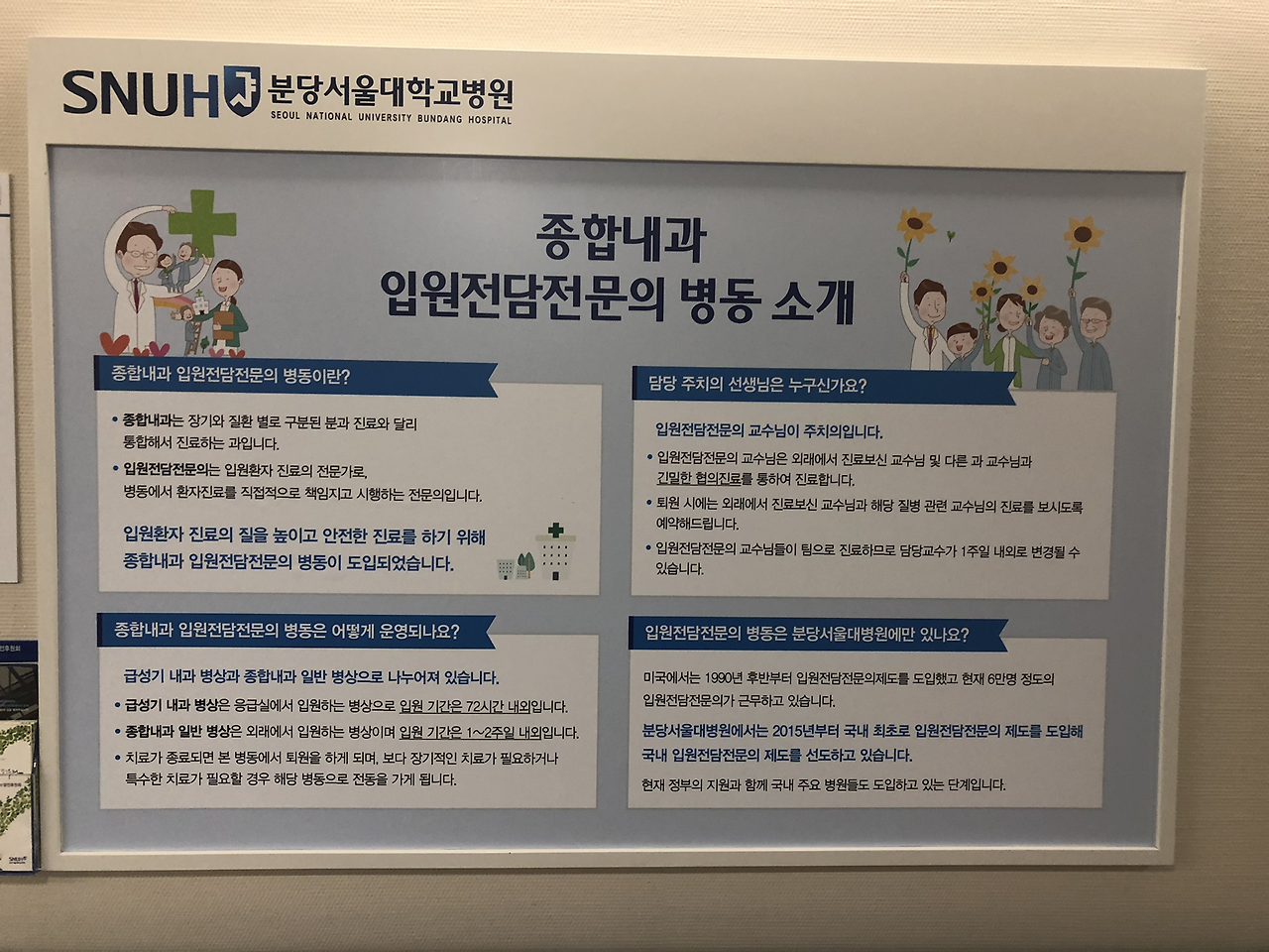작년 하반기부터 입원의학연구회 집담회가 운영되고 있습니다. 오늘은 분당서울대병원에서 집담회가 열렸고 분당서울대 종합내과 소개 및 병동 Tour도 같이 했습니다.내/외과 연구회에서 전국의 많은 내/외과계 입원전담전문의들이 고민하고 노력하고 있습니다.참고로 입원의학연구회 창립총회는 19년 4월 27일 내과 춘계학회때 열릴 예정입니다.
