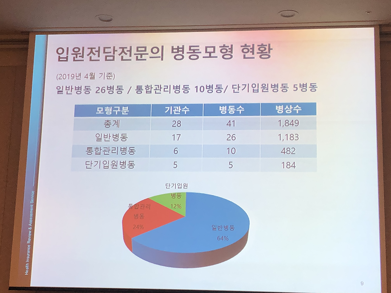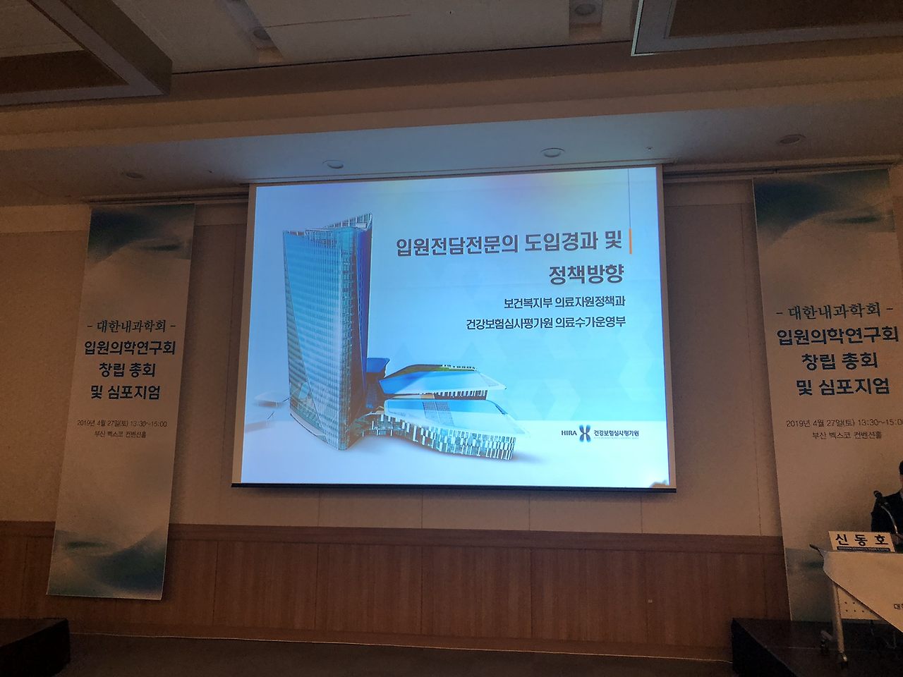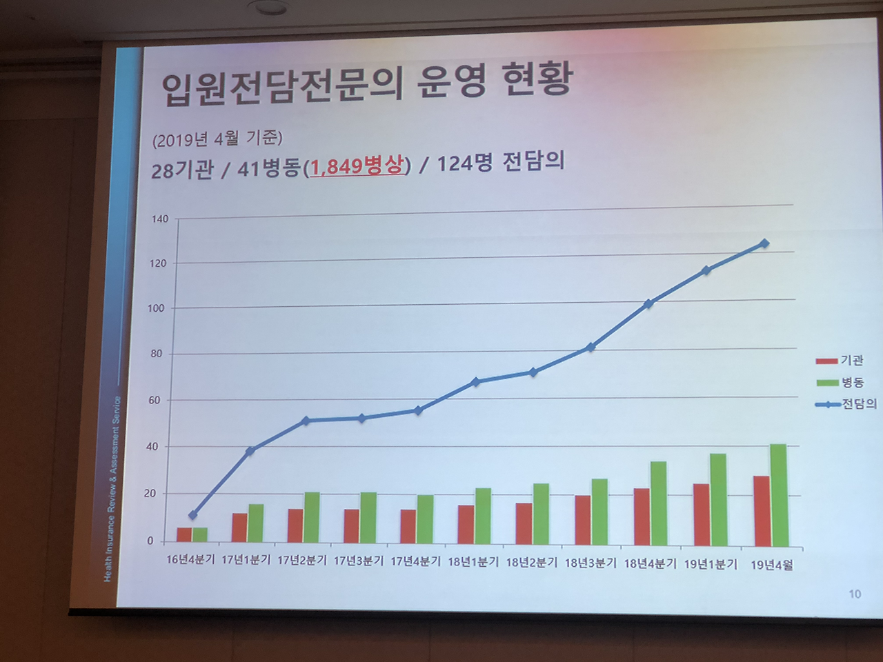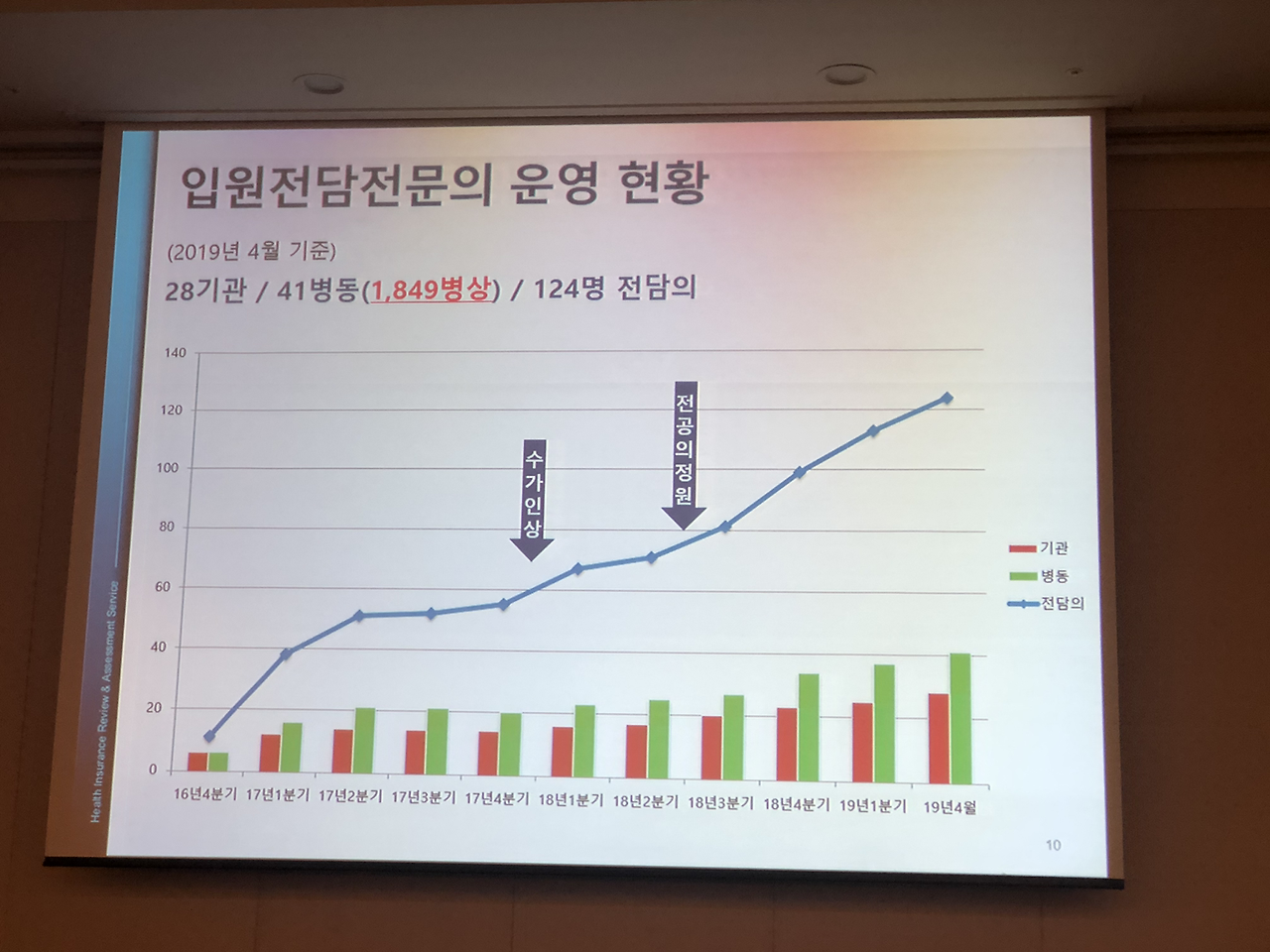 대한내과학회 입원의학연구회 창립총회 이후 심포지엄도 있었습니다.심평원 의료수가실 의료수가운영부 김미향 부장님과 강남세브란스 병원의 박승교 교수님, 분당서울대 병원의 온정헌 교수님의 강의가 있었습니다.현재 2019년 4월 기준 전국의 입원전담전문의는 28기관 41병동에 총 124명이고 내과 입원전담전문의는 71명으로 전체 57.3 프로입니다.