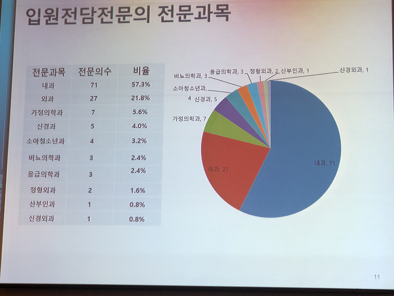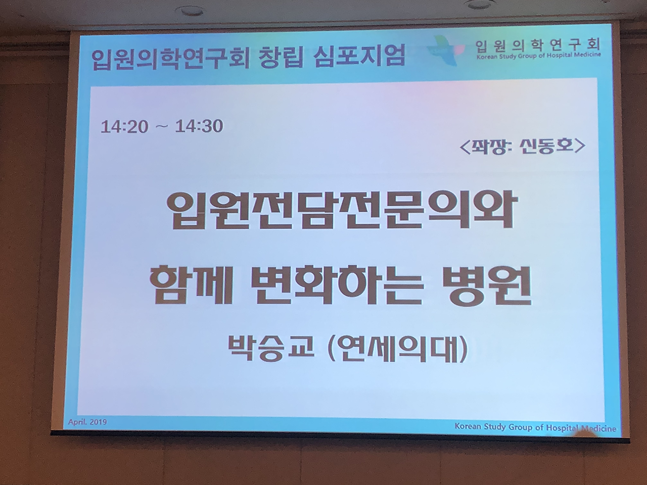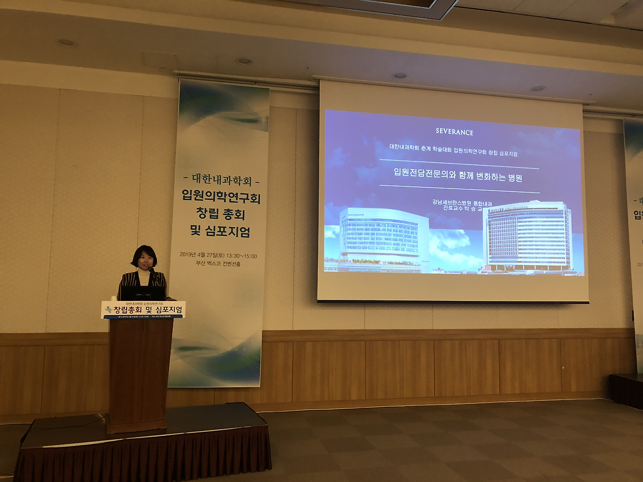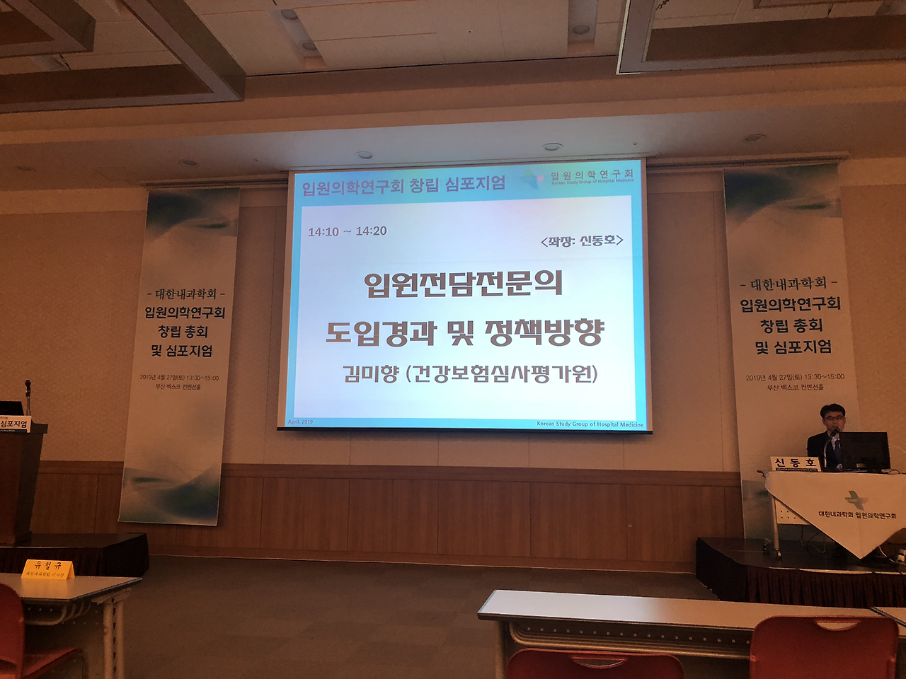 대한내과학회 입원의학연구회 창립총회 이후 심포지엄도 있었습니다.심평원 의료수가실 의료수가운영부 김미향 부장님과 강남세브란스 병원의 박승교 교수님, 분당서울대 병원의 온정헌 교수님의 강의가 있었습니다.현재 2019년 4월 기준 전국의 입원전담전문의는 28기관 41병동에 총 124명이고 내과 입원전담전문의는 71명으로 전체 57.3 프로입니다.