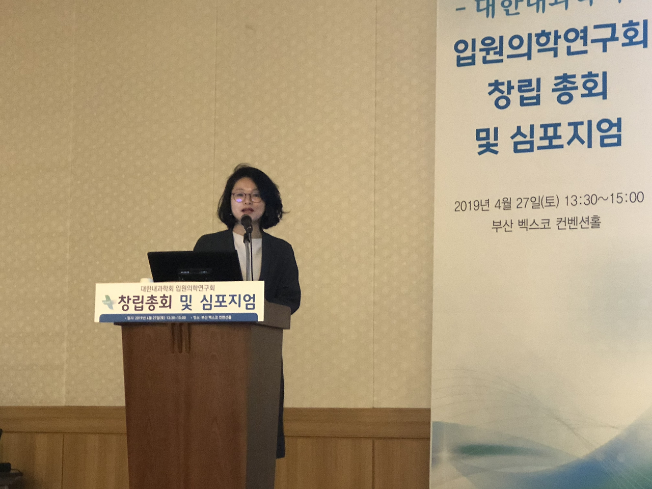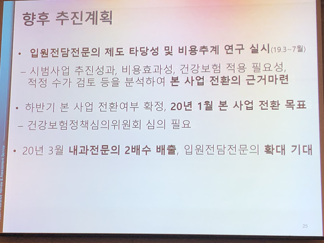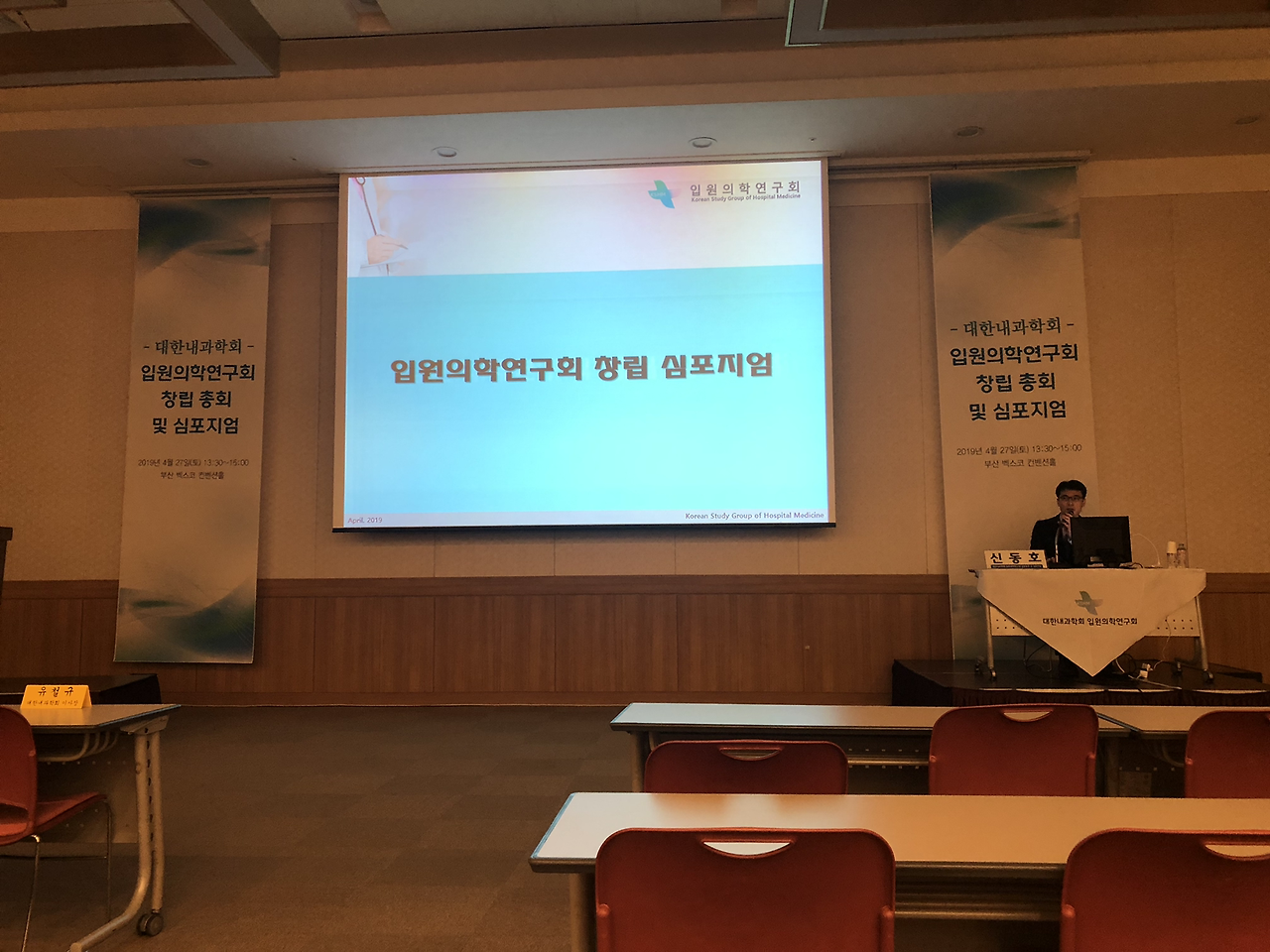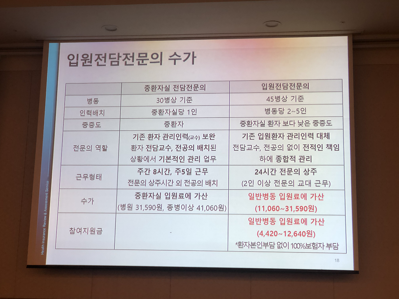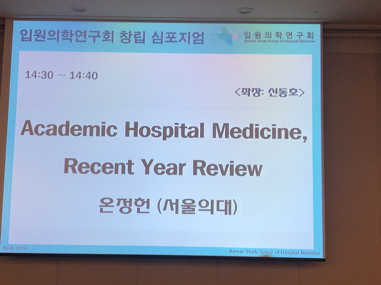 대한내과학회 입원의학연구회 창립총회 이후 심포지엄도 있었습니다.심평원 의료수가실 의료수가운영부 김미향 부장님과 강남세브란스 병원의 박승교 교수님, 분당서울대 병원의 온정헌 교수님의 강의가 있었습니다.현재 2019년 4월 기준 전국의 입원전담전문의는 28기관 41병동에 총 124명이고 내과 입원전담전문의는 71명으로 전체 57.3 프로입니다.