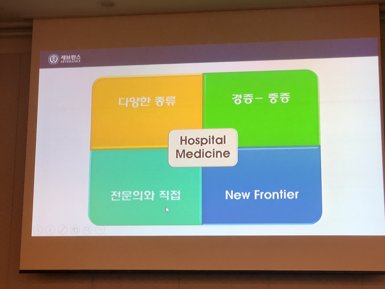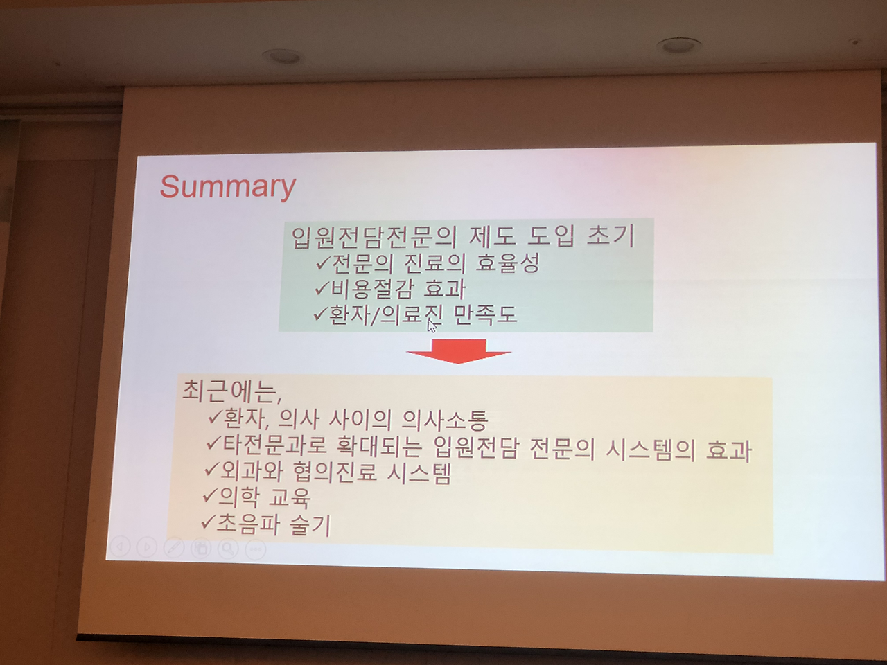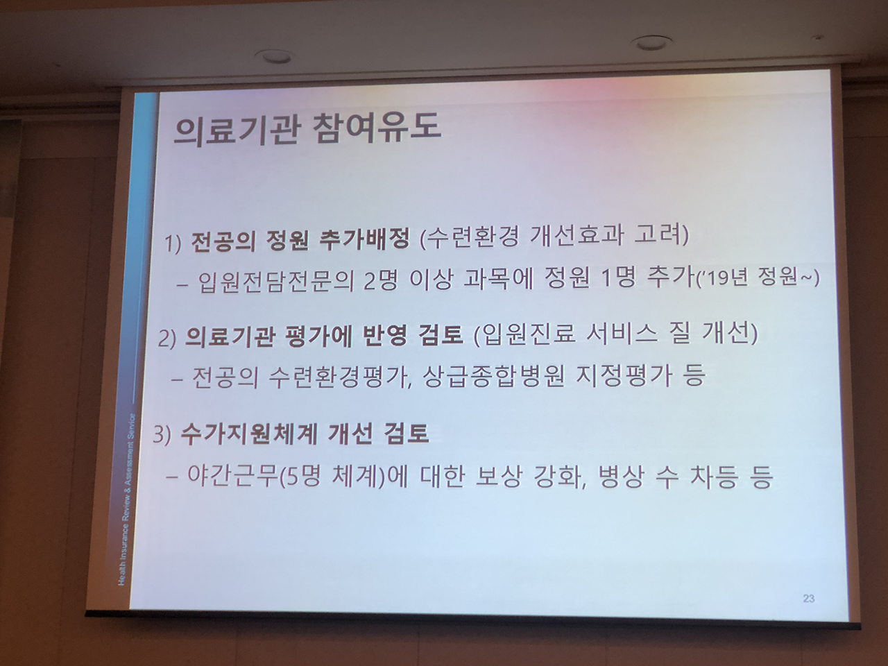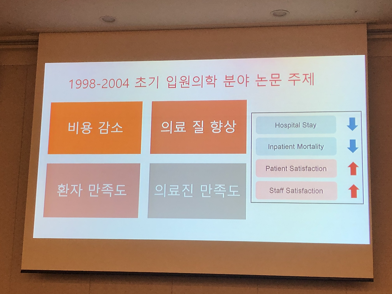 대한내과학회 입원의학연구회 창립총회 이후 심포지엄도 있었습니다.심평원 의료수가실 의료수가운영부 김미향 부장님과 강남세브란스 병원의 박승교 교수님, 분당서울대 병원의 온정헌 교수님의 강의가 있었습니다.현재 2019년 4월 기준 전국의 입원전담전문의는 28기관 41병동에 총 124명이고 내과 입원전담전문의는 71명으로 전체 57.3 프로입니다.