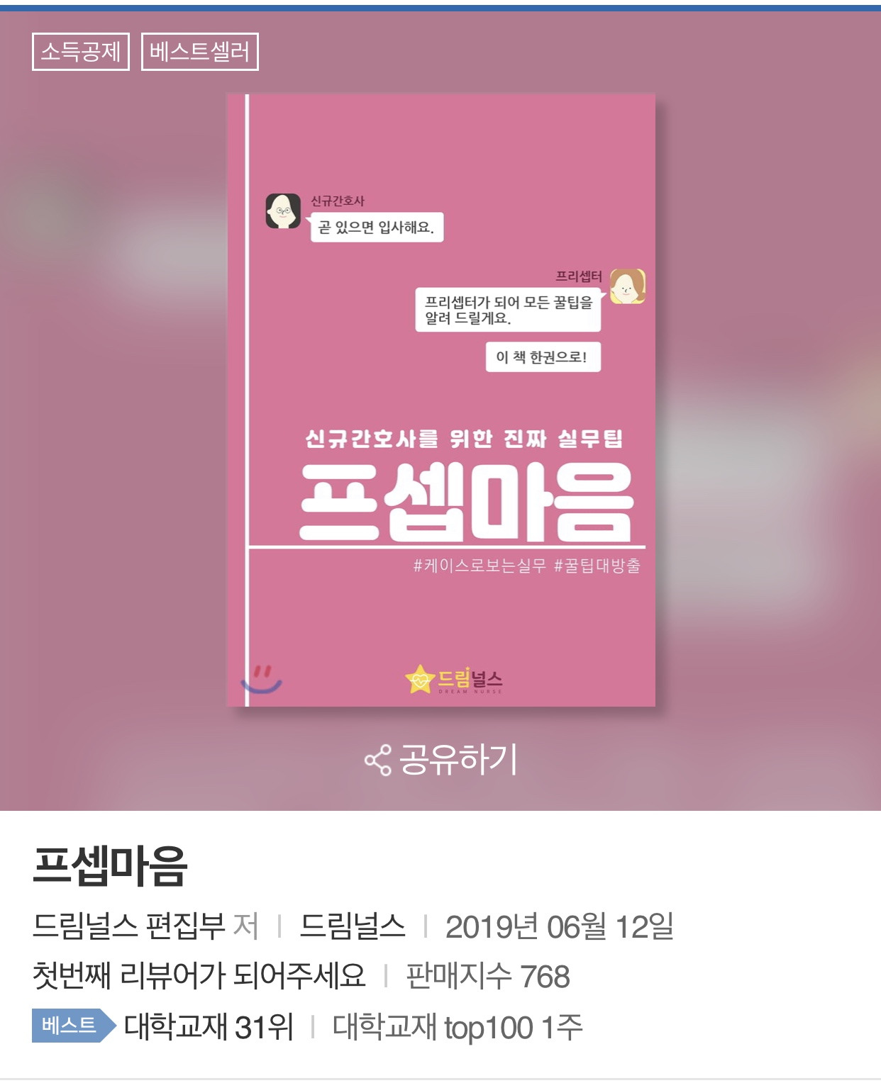 드림널스에서 나온 신규 간호사를 위한 프셉마음검토해 보았는데 신규 간호사분들의 눈높이에서 쓴 교재라고 생각합니다.인기가 많고 계속 응원합니다.