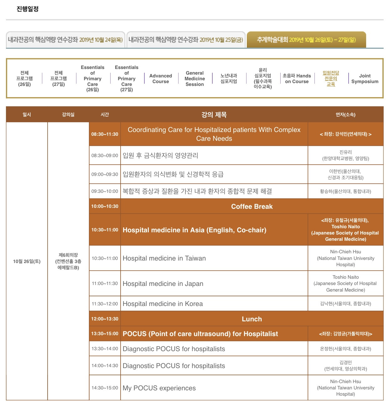 이번달 말일 주말인 10.26-10.27 대한내과학회 추계학술대회가 있고 10.26에 입원전담전문의 세션이 있습니다.대만, 일본의 입원의학 경험 공유 및 POCUS 세션도 있습니다. 사전 등록은 10.16까지 입니다.