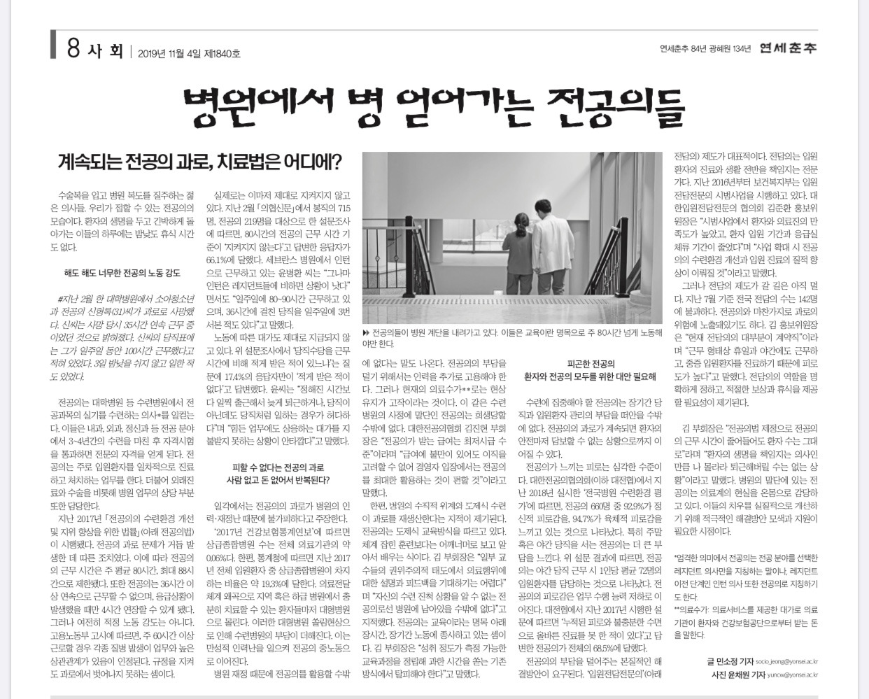 연세춘추 민소정 기자님과 입원전담전문의 관련 인터뷰하였던 기사가 나왔네요. 입원전담전문의에 관심가져주셔서 감사합니다.