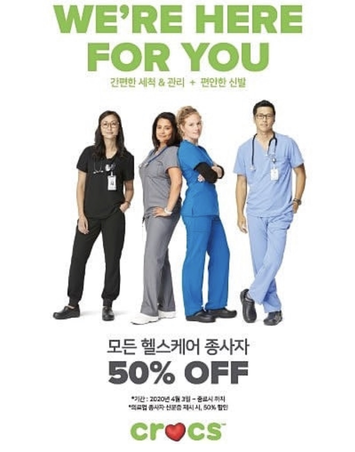 의료인 증명 서류 가져오면 오프라인 매장에서 사진찍어서 본사에 제출하고 50프로 할인해 주네요크록스(Crocs)와 이해 관계 없습니다^^