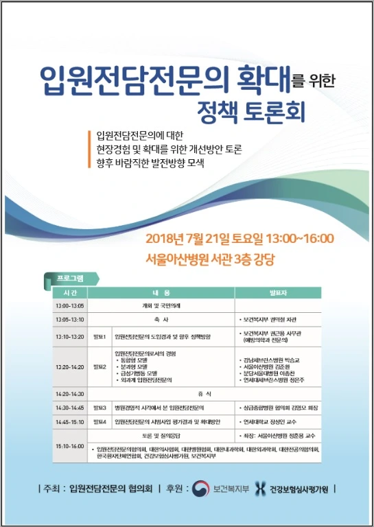 10일 정도 남은 입원전담전문의 확대 위한 정책 토론회 안내입니다. 관심있는 선생님들의 많은 참석 부탁드립니다.입원전담전문의협의회는 오는 21일 오후 1시 서울아산병원 서관 3층 강당에서 '입원전담전문의 확대를 위한 정책토론회'를 개최한다.기사링크http://m.yakup.com/?m=n&mode=view&nid=220011