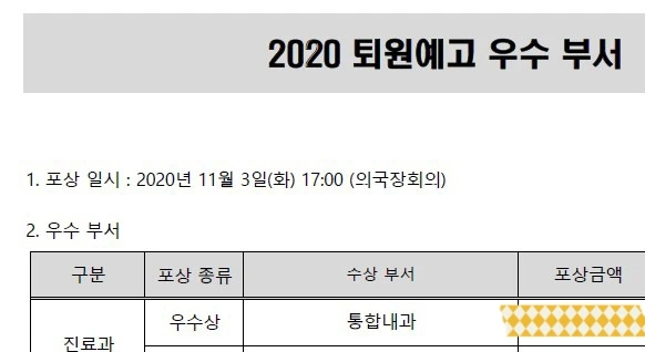 입원전담전문의의 여러 지표(재원기간, 재입원율, 원내 사망률, 긴급대응팀 호출건수, 동료 만족도, 환자 및 보호자 만족도 등) 중 퇴원 예고제 지표를 향상시켜서 병원내에서 수상하게 되었습니다.
