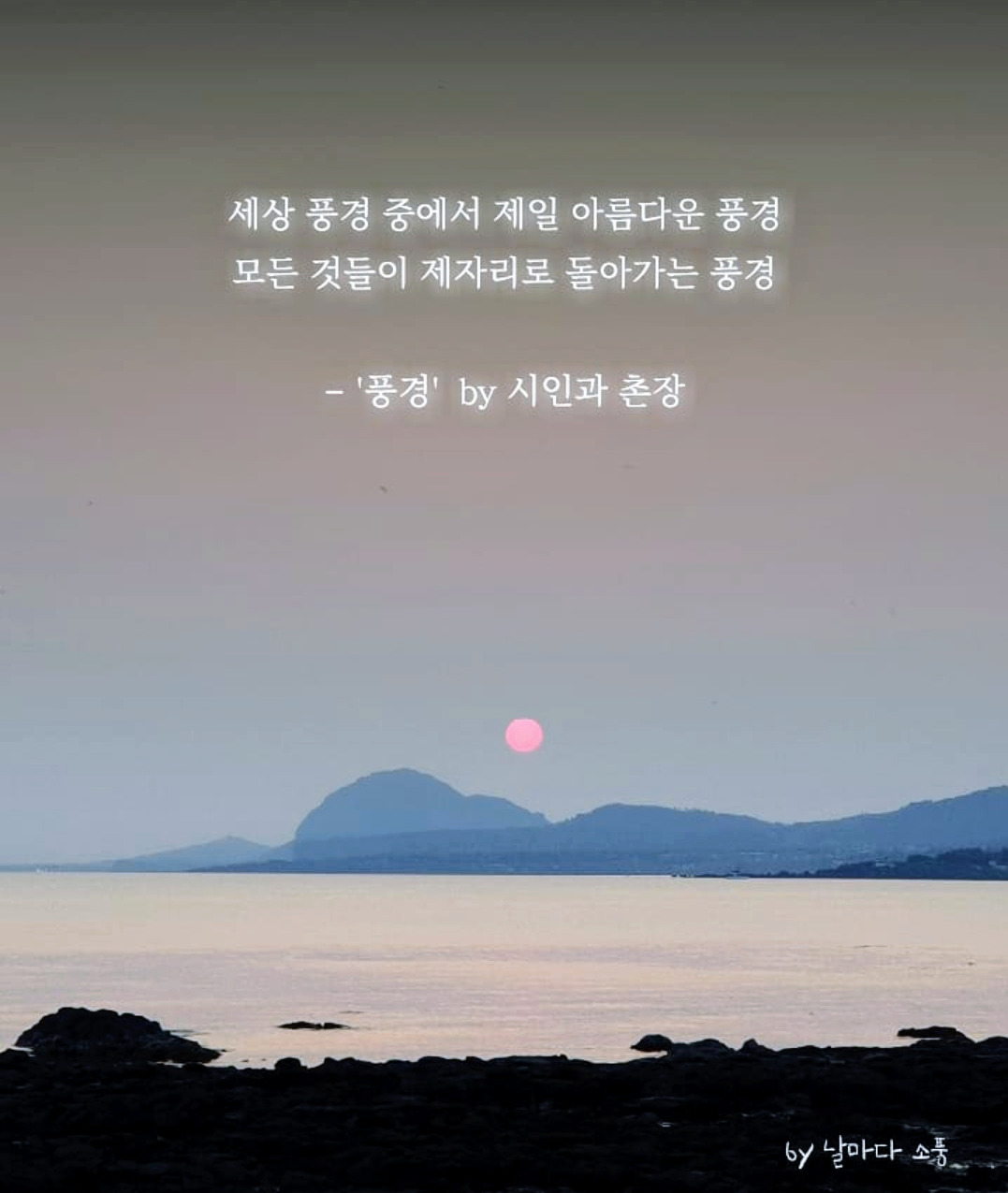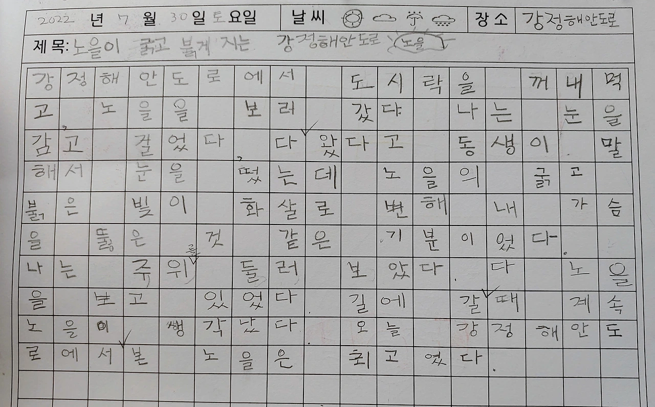 [ 강정해안도로에서 도시락을 꺼내 먹고 노을을 보러 갔다. 나는 (일부러) 눈을 감고 걸었다. 다 왔다고 동생이 말해서 눈을 떴는데, 노을의 굵고 붉은 빛이 화살로 변해 내 가슴을 뚫는 것 같은 기분이었다.