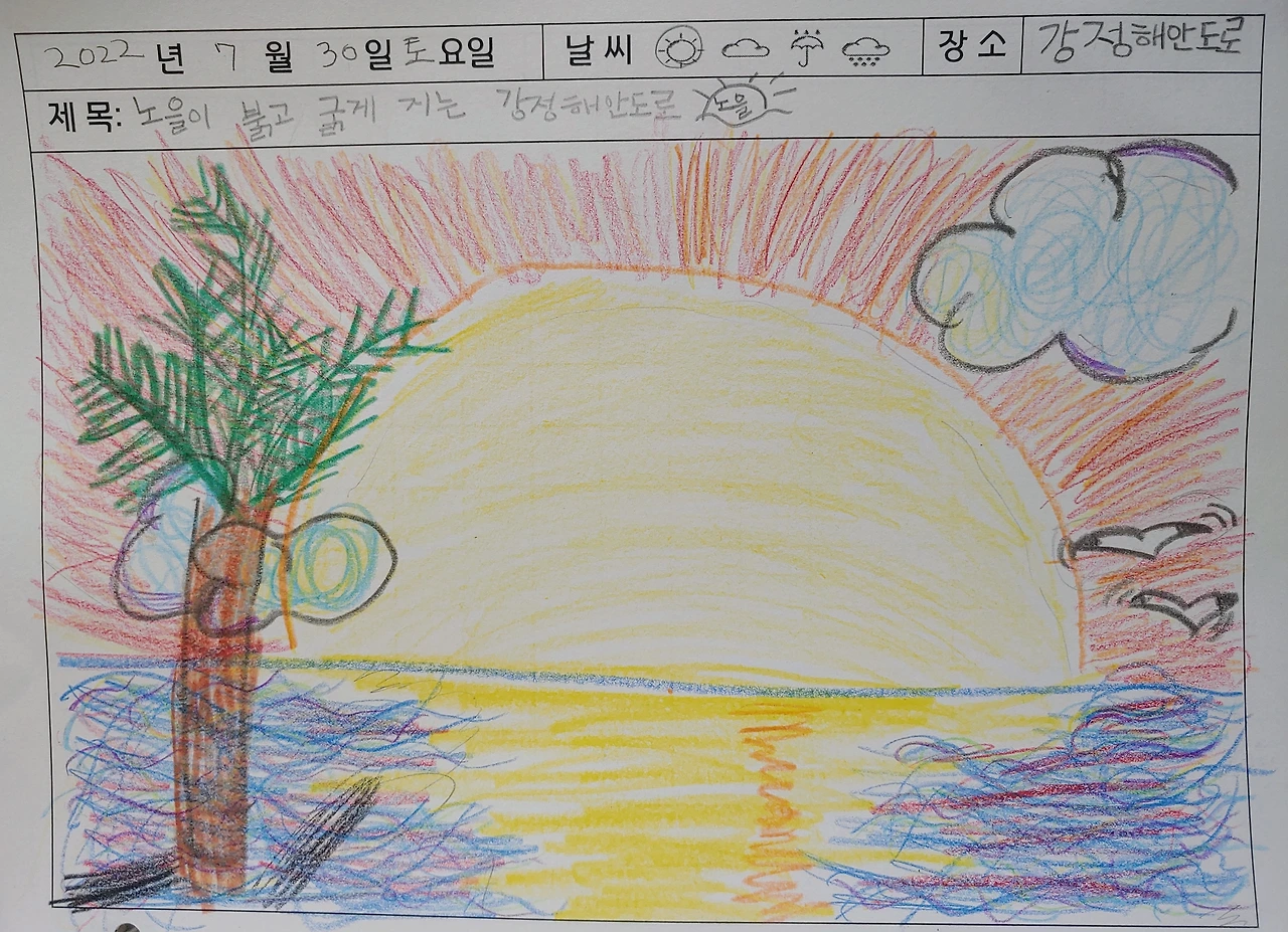 딸의 일기를 읽으며 잠시 감상에 젖었다가 의아한 점을 발견했다. 단비의 그림은 일몰보다는 일출에 가까워 보였다.(나의 비판적 사고력은 딸의 그림 앞에서도 낄끼빠빠를 할 줄 모른다) 이상하다? 우린 그날 분명 일몰을 봤는데... 단비가 뜨는 해와 지는 해를 구분 못하는 걸까?