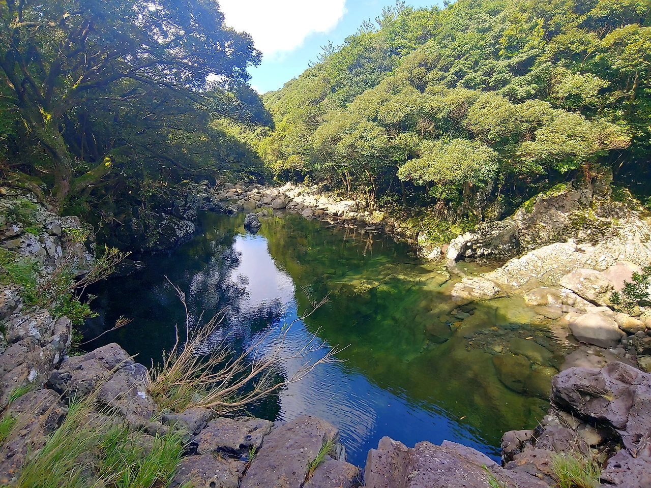초록은 짙었고 물빛은 깊었다. 시작부터 예감이 좋았다. 속괴를 지나 오소록한 길을 몇 분 더 걷자 폭포 소리가 들렸다. 내가 생각했던 그곳이 맞았구나! 그런데 어떻게 여기를 내려가지? 로프를 타고 내려가 볼까 했지만 아무래도 혼자 내려가기엔 위험해 보였다. 분명 주위에 내려가는 길이 있을 거야. 반경 100m를 샅샅이 뒤졌다. 찾았다! 내려가는 길은 내가 예상했던 지점의 반대편에 있었다. 밑으로 내려갈수록 폭포 소리가 가까워졌다.