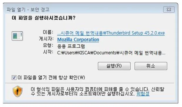 Thunderbird Setup.exe 파일을 더블-클릭한다. 그러면 이 파일을 실행할 것인지 묻는 다이얼로그 박스가 나온다.