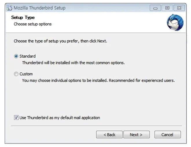 기본 설치(Standard Setup)를 선택하고, [다음(Next)] 버튼을 클릭하면 썬더버드가 설치되는 디렉토리 정보를 보여준다.