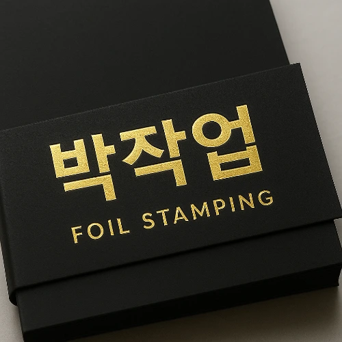 - 박(foil) 작업 : 금속 재질의 박(foil)을 인쇄물에 열과 압력을 가하여 부착하는 후가공 기법