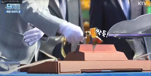 <도끼로 진수선을 자르는 모습, KTV 캡처분 https://youtu.be/co_w-0 Qt7 Mo >