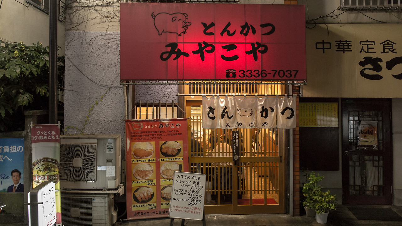 오늘의 2번째 하이라이트, 미야코야의 저녁 영업이 시작될 때까지 푸르스름한 사기노미야에 익숙해지기로 한다. 5시 20여분 정도, 불이 꺼진 미야코야에 도착해서 잠자코 기다리는 순간 딱- 하고 노란 불이 들어온다. 무뚝뚝하지만 친철해보이는 배가 많이 나온 할아버지가 안으로 안내한다.