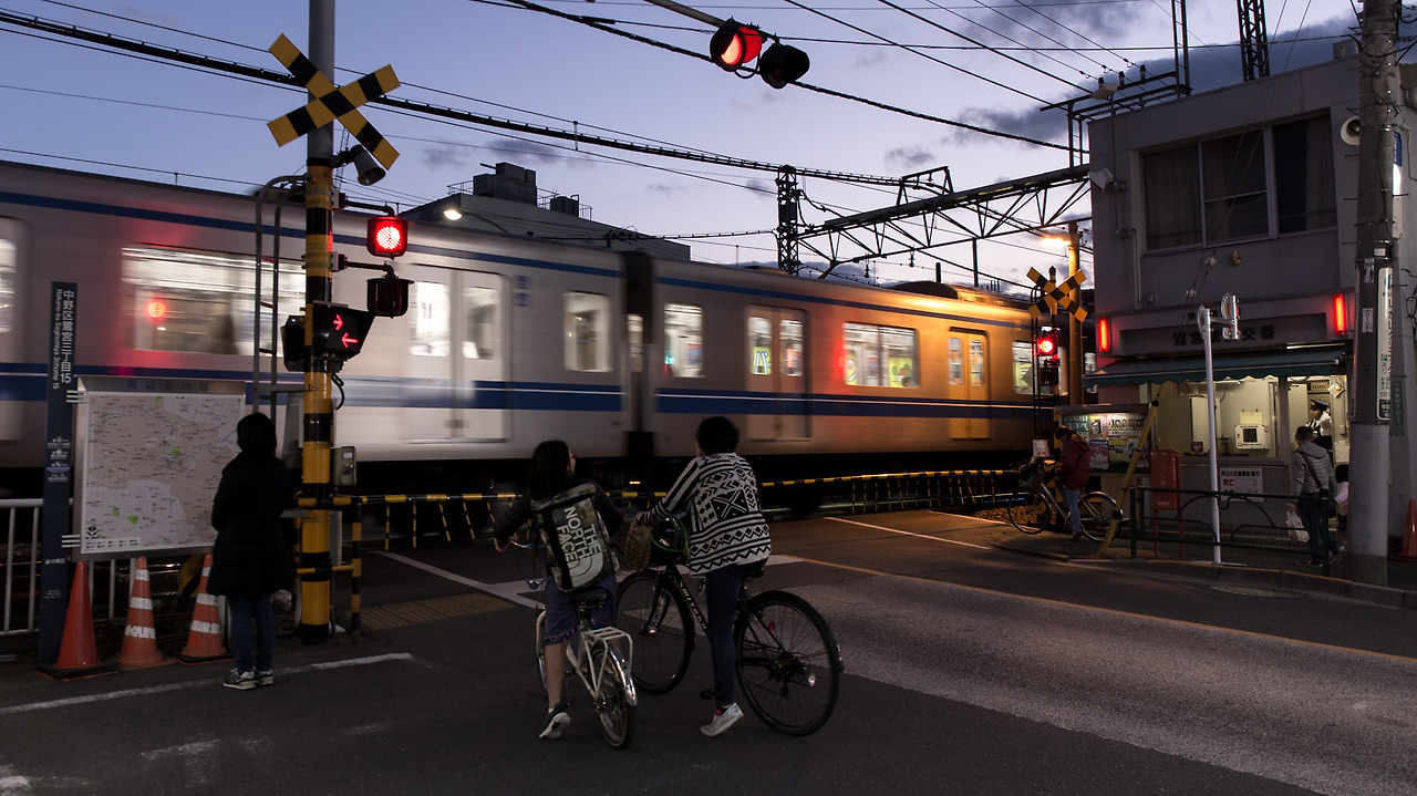 버스 노선은 구글맵보다 아사가야 행인의 정보가 더 정확했다. 01번이 아닌 22번 버스로 무사히 사기노미야(鷺ノ宮)에 도착. 해가 지는 방향으로 얄미울 정도로 구름이 가득하다. 한 낮에 그렇게 찾았을 때는 나타나지도 않더니. 이제 일본의 철길은 제법 익숙한 것 중 하나이지만, 아직 남아있는 하늘의 보랏빛을 배경으로 오렌지 색 가로등을 조명삼아 보면 여전히 매혹적인 풍경이 된다.