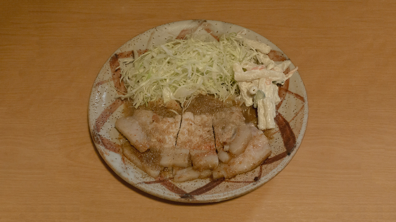 이번에도 가게에 손님은 나뿐이다. 스모 채널이 켜진채 음소거 되어 있다. 조용하고 깨끗한 실내. ㄱ자로 꺽인 닷지석이 전부인줄 알았지만 가게 안쪽에는 4인석 테이블까지 있다. 조금 무리해서 메뉴 2개를 고르기로 한다. 로스까스 정식과 로스마늘구이. 메뉴당 오토오시 1개가 규칙인가 보다. 같은 오토오시가 2개나 놓여있으니 조금 우스운 모양새가 된다.