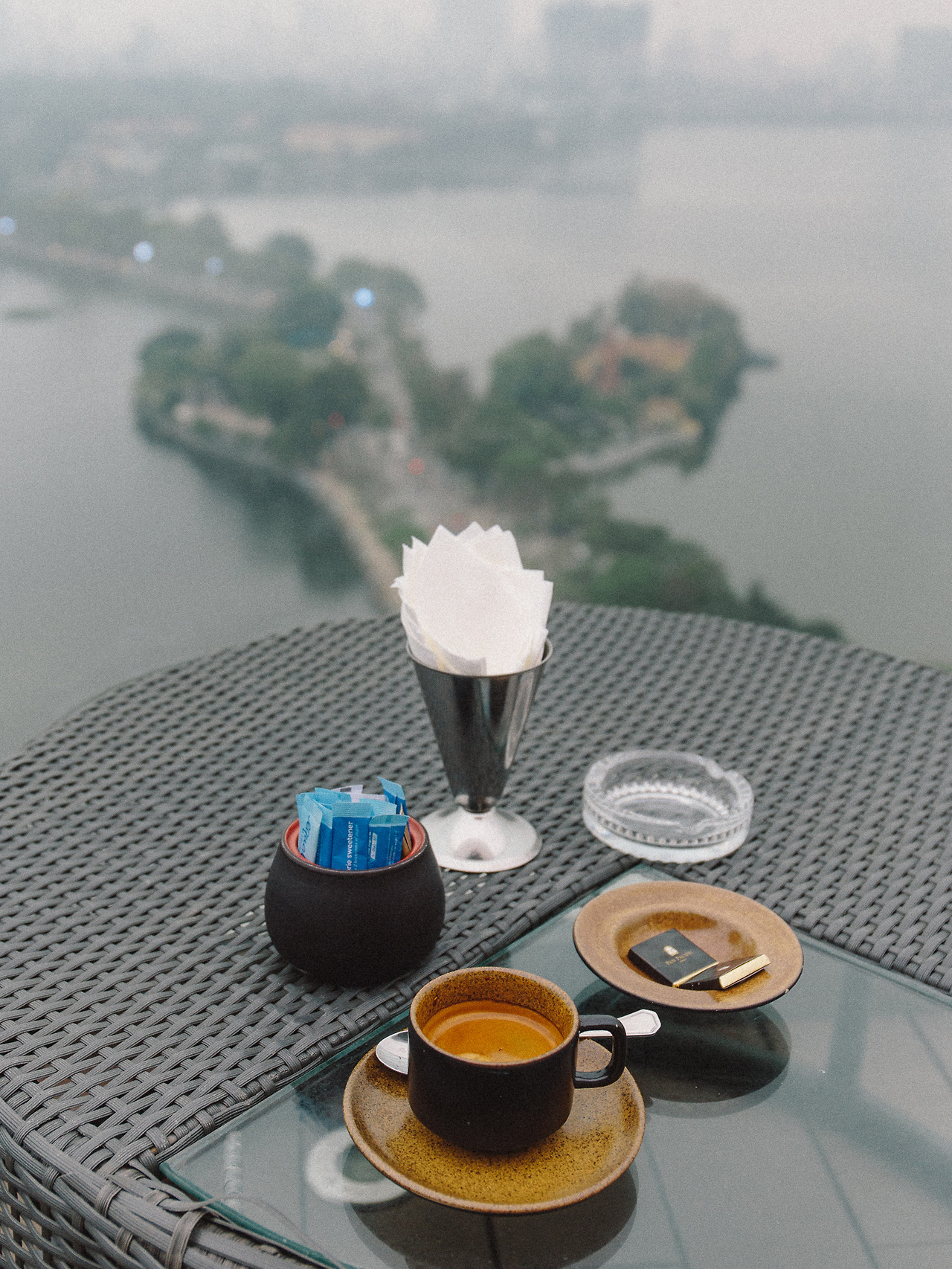 구시가지 거리와 같은 도시에 있다는 것이 믿기지 않을 만큼 세련된 Pan Pacific Hanoi 호텔의 최상층으로 이동하면, 하노이에서 가장 낭만적인 산책길을 조금 더 멋지게 볼 수 있다. 엘리베이터 문이 열리자 시원한 에어컨 바람과 함께 한껏 격식을 차린 복장의 직원들이 인사를 건넨다. 써밋 라운지 Summit Lounge 의 오픈 시간은 오후 4시부터지만 아직 손님은 한 명도 없다. 당연히 흡연석인 야외 테라스도 텅 빈 상황. 흐린 날씨 덕에 멀리 있는 빌딩들의 디테일까지는 보이지 않지만 방금까지 걸러온 산책길은 문제없이 잘 보인다!